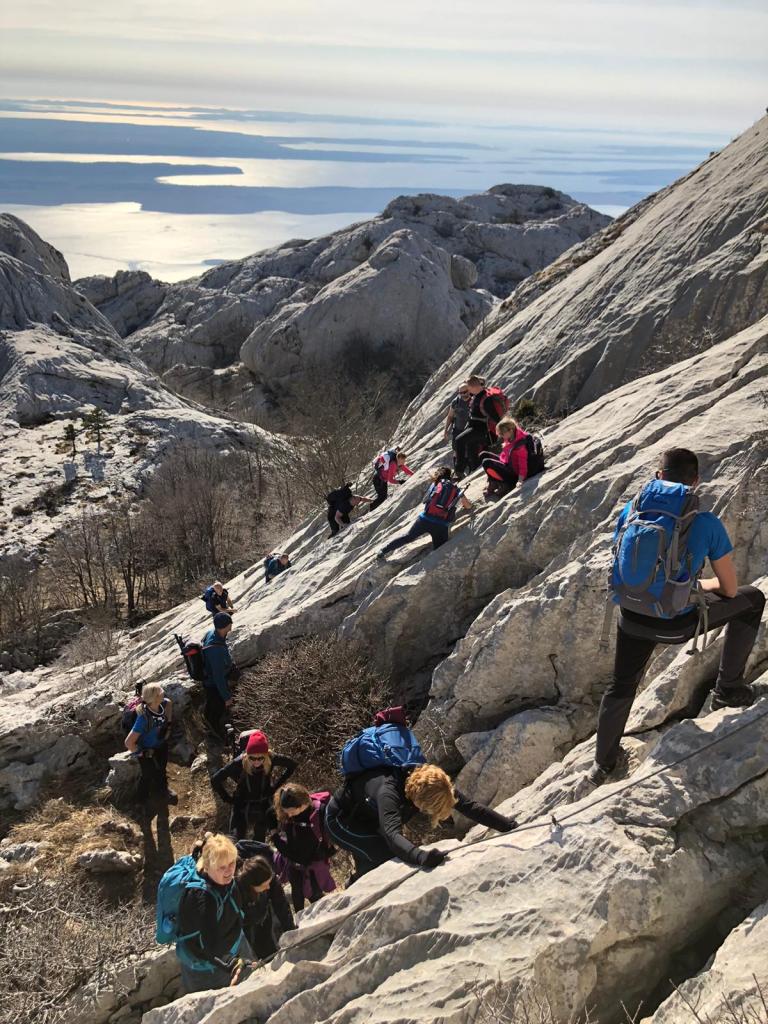 Nakon tri sata pauza na dolcu pod Žlibatim kukom (850 m). Samo što sam sjela i zagrizla kroasan, evo Jurice: “Idemo do praga tko hoće, krasan je pogled na more!”. Ostavljam sve osim mobitela i idem. Uzbudljiv je to uspon po stijeni bio. Ne dulji od 10 min po žlijebu glatke stijene, nigdje utora za nogu, slabo za ruku, ali uspjela sam! Točnije nas 13 od 18 se ispentralo i da, vrijedilo je. Volim tu spontanost ovog društva, da nije sve isprogramirano, da se može skrenuti s puta, to je avantura onda!
