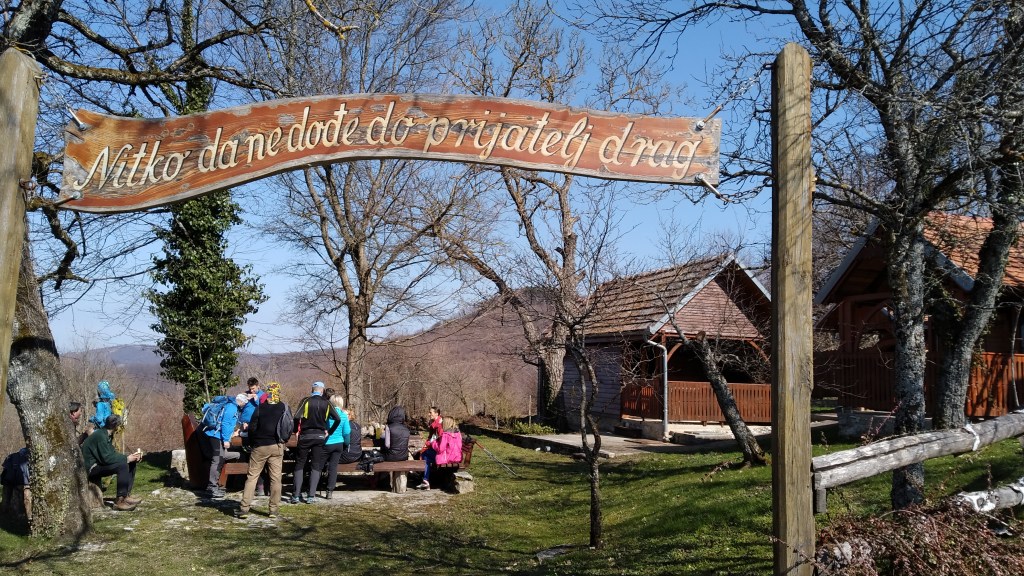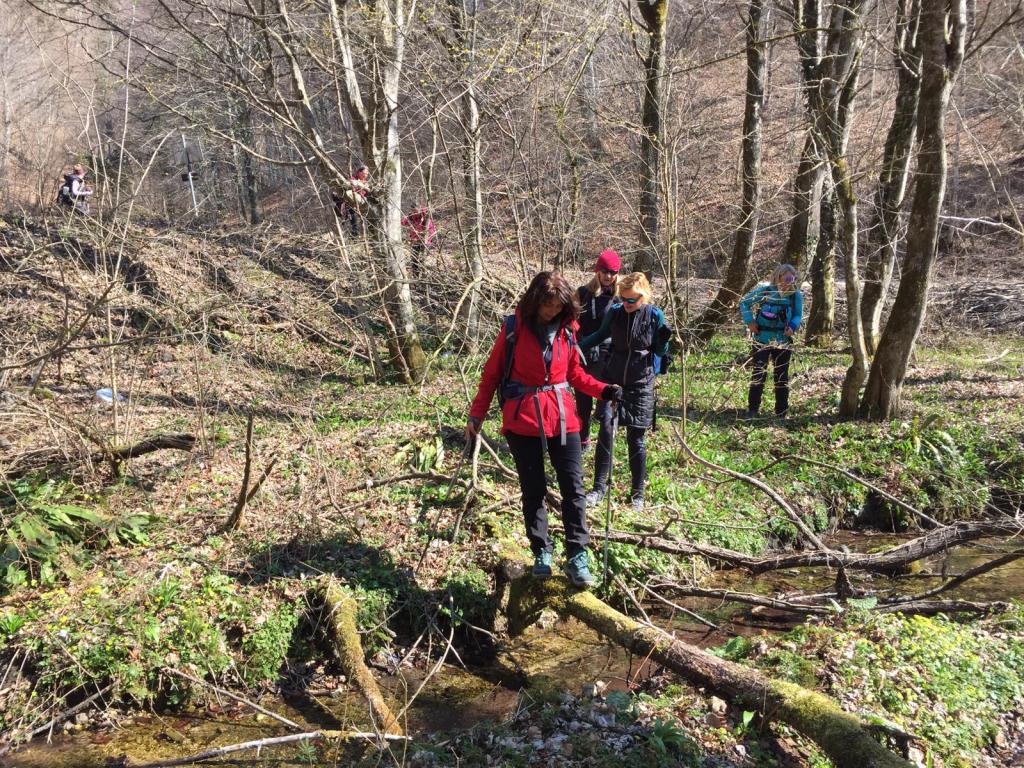 9:30 kod pd Žitnica (815 m) ispod Japetića uživamo u pogledu i pogaćicama od sira by Kety. I ja sam ispekla kolač. Osjećam da će ovo biti gastro izlet danas. 10:15 Selo Grabarak je nenaseljeno, no vlasnici kuća ga održavaju i dolaze vikendom. Veliki drveni stol kao da je na nas čekao. Zvuci pjesme “došel bum doma sel si bum…” našeg DJ-a Antuna ne daju da samo produljimo dalje, a da stol ne bude prazan tu su Jasminkine vočne veganske kocke. Ovim tempom nećemo daleko stići. Spuštamo se strmom šumom prema kapelici kraj Žumberačke rječice. Prelazimo ju po srušenom stablu što mi je već dugo želja.