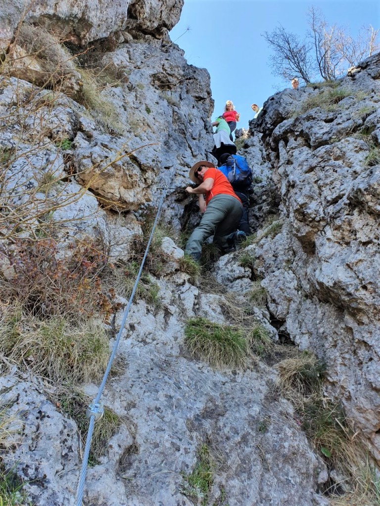 Prema Klečicama idemo. Prvi zahtjevniji uspon. Pustio je Dubravka naprijed da vidi kako će on to savladati te prionuo. Zalijeće se – ne uspijeva. Ponovo – ne ide. Vrača se metar unazad, hvata zalet, zemlja leti, kamenje frca pod njegovim nogama – uspio je. Hmm, uporan je. Uspon na Klečice je stijena osigurana sajlama i jedan uski kuloar. Dubravko je iskoristio znanje iz čvorologije i svezao ga za stablo. Time je osigurao siguran uspon nama i siguran ostanak njemu. Nije bio time zadovoljan, pa je Nina ostala tješiti ga i umirivati. Uzbudljiv, ali ugodan uspon uz pomoć sajli je to. Treba biti oprezan. Nekima je to prvo takvo iskustvo, pa su zabrinuti, a nakon uspješnog spuštanja bit će ushićeni. Dugo guštamo na vrhu. Dan je savršen. Oslobađamo Medu i nastavljamo zajedno prema Kleku.