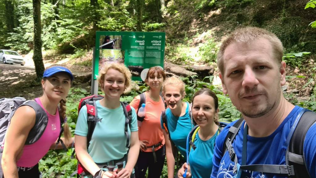 Obilazimo sve zadane točke M1 i slikamo se kod svake (Antonia i Kruno rade selfie) premda nemamo kome što dokazivati, ali eto za nas. Do Kraljićinog zdenca se spuštamo da bi se Mrcinom popeli do Sljemena. Mogla bih mjeriti težinu uspona brojem kapi znoja koje mi kaplju s nosa u minuti. Ni spuštanje do potoka i odmorišta Srnec ne propuštamo da bi se popeli po 500 Horvatovih stuba.