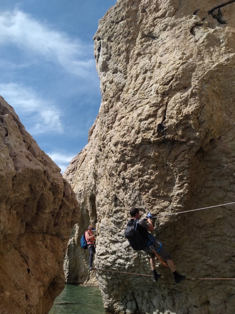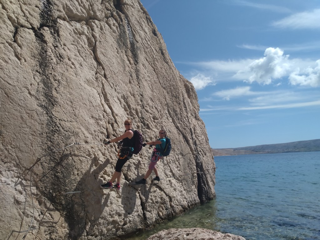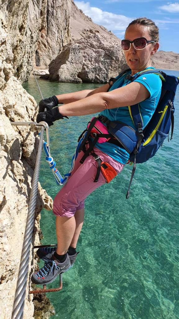 15:00 Najvažnija uvala danas je uvala Slana jer je ovdje Š. Cimerman vrlo vješto ukomponirao kratku i pikantnu feratu. Duga je cca 100 m, 2 m iznad mora dubokog oko 1 m. Vruće je i već smo satima na suncu, a zaklona ni ovdje nema. Nemamo strpljenja za odmor na suncu. Stavljamo pojas, paničar, penjačke rukavice i brže bolje hvatamo se sajle da se uhvatimo u koštac s ovom neizvjesnom dionicom. Ruksaci nam sigurno ne pomažu, ali izbora nemamo. Puno je prevjesa. Tijelo visi unazad i ovisi o rukama. Ulazimo u tzv. sobice. Imala sam paničar duljine oko 40 cm što se pokazalo savršenim jer je kraći od ruku. Zapravo sam se vozila na sajli i po potrebi dizala na ruke da se prekopčam. Dobar je osjećaj bezbrižno visiti – sjediti u pojasu. Danas sam to prvi put isprobala. Dobar je to bio osjećaj jer sam kao plan B imala i ipsilon. Sigurno je sigurno. Bilo je to, svejedno, adrenalinskih 30 minuta.