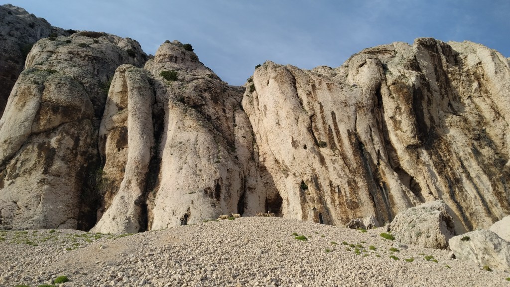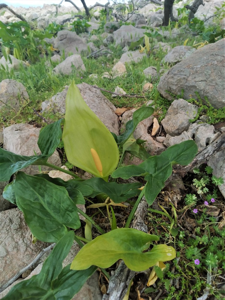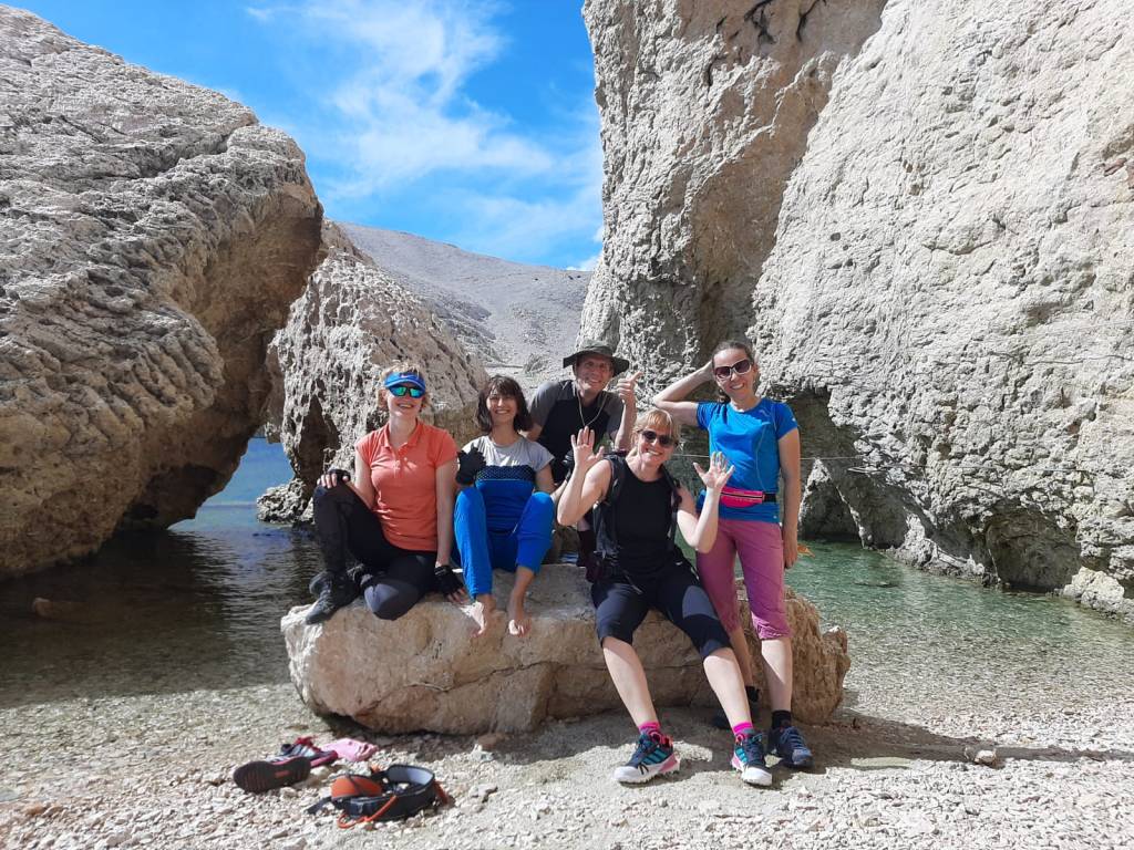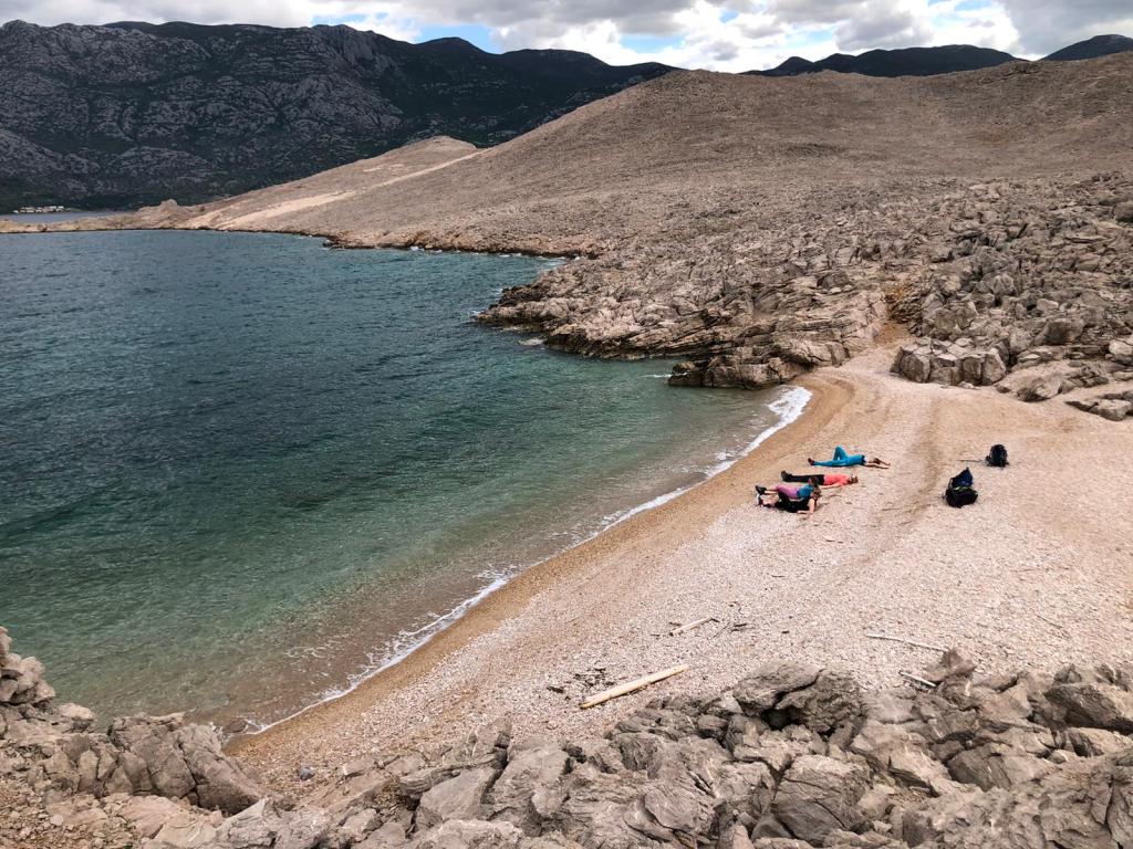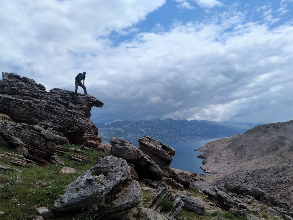 9:00 Veselo gazim paškim kamenjarom u Sandrinim mekim tenisicama prema  prvoj od 8 uvala danas. Jurica nam je pripremio uzbudljivu turu za današnju avanturu. Jaču nego Š. Cimerman za treking, bez ijednog koraka po asfaltu i većom visinskom razlikom od Challenger kategorije, a iste kilometraže. Jezdimo tako prostranstvom paškoga krša kud god Jurica kaže. Na suprotnu stranu otoka idemo do plaže Nova pošta kanjonom, kojim je prije nas samo voda prošla, na doručak. Drugim kanjonom gore do Panosa (218 m), kojim ni ovce ne idu, niti trava ne niče utiremo nove puteve za neke nove ovce. Stalno nas nešto skreće s puta. Neobično cvijeće poput kala, a ima ih bezbroj. Kasnije saznajem da se zove kozlac i da je jako otrovan za čovjeka, dok ga divlje svinje obožavaju. Nisam ga ni mislila jesti, ali otrovan? Svašta.