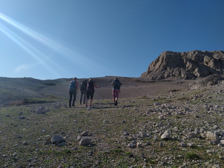 17:30 Okrijepljeni i odmoreni vraćamo ruksake na leđa. Preko brda idemo, uvalu Slana iz drugog kuta gledamo. Pored tužnog mjesta konclogora u tišini prolazimo. Spuštamo se do uvale Beritnica, dalje se dižemo teškim kamenim terenom da bi zajedno sa suncem u uvali Ručica završili današnju planinarsku avanturu. Divnog li kraja dana!