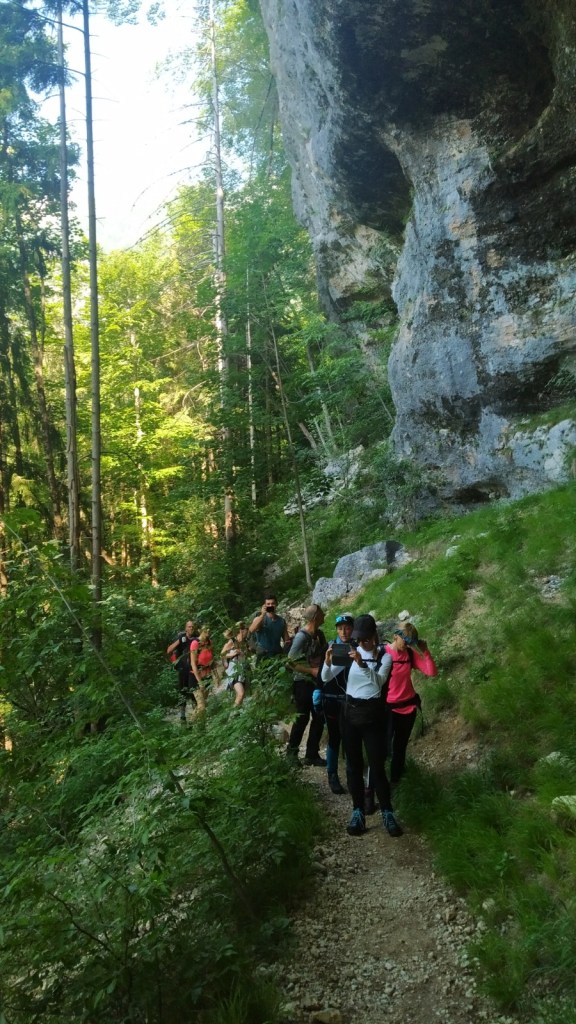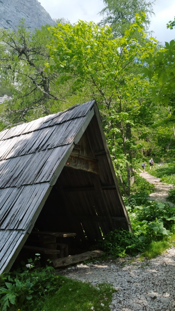 9:00 Aute ostavljamo u Kamniškoj Bistrici (596 m), naselju s istoimenom rijekom podno alpskih vrhova. Zadivljeni već ovim ambijentom radosno nabacujemo ruksake na leđa. Gojzerice same kreću put bukove šume dok se probijamo kroz pjev ptica. Slovenija! To je bilo savršeno za moje oči dok posljednji red obrane od znoja – obrve nije popustio. Oči me peku, jako je sparno, vruće, ni daška vjetra, a uspon konstantan. Teško je. Nije to Velebit da se malo penjemo – malo spuštamo. Kupit ću mjeh za sljedeći izlet da mogu stalno piti gutljaj po gutljaj vode. 11:15 Doručak kod simpatičnog skloništa Pastirji. Yes!