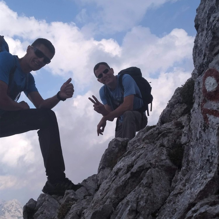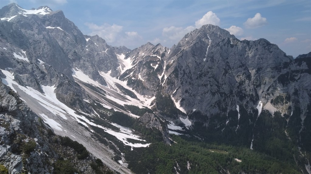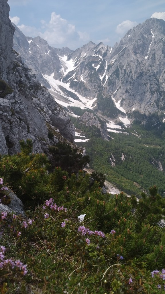 Popeli smo se na greben tražeći pogled na Logarsku dolinu, najljepših 7 km Slovenije. Slap Rinka visine 100 m odavde je malen. Kolega diže dron i baš smo razgovarali o toj tehnologiji i potrebnim dozvolama (koje možda i nema) kad nam se pridružuju dvije simpatične Slovenke od kojih je jedna, zamislite, baš kontrolor leta. Ha-ha! Sad smo prijatelji na FB. 🙂
