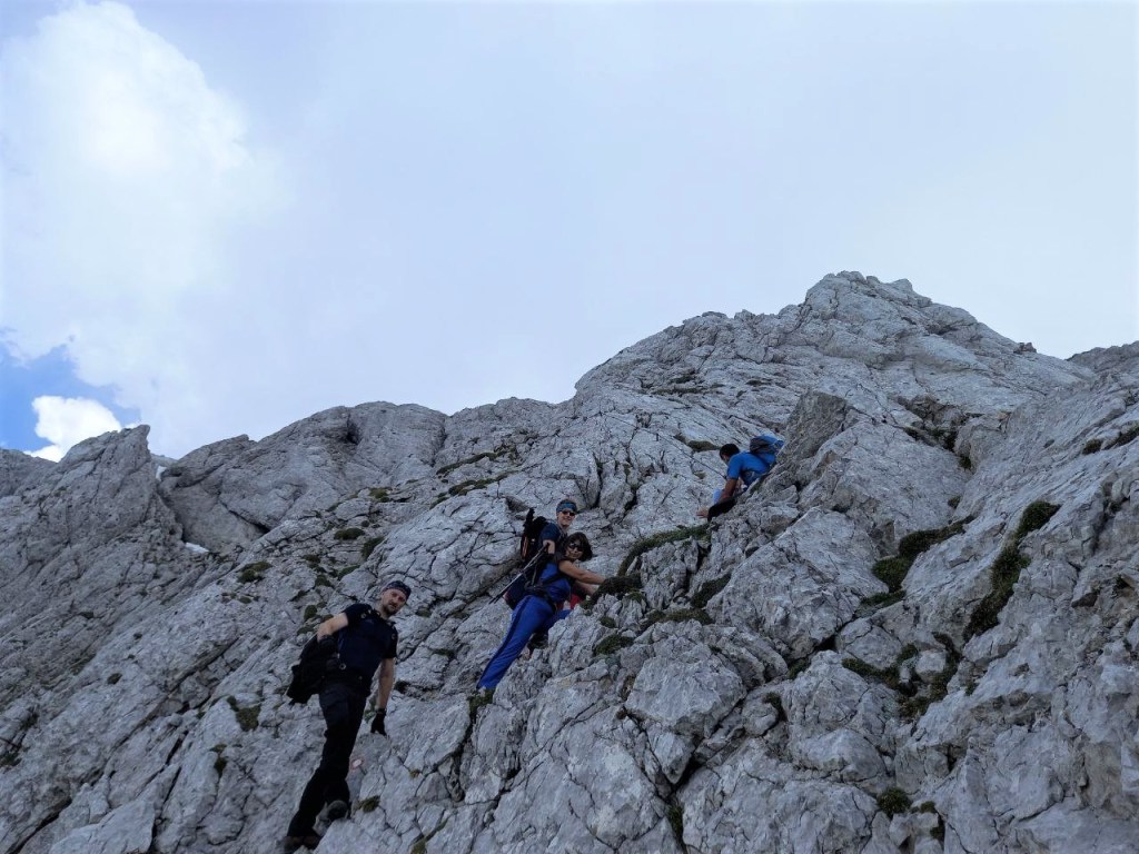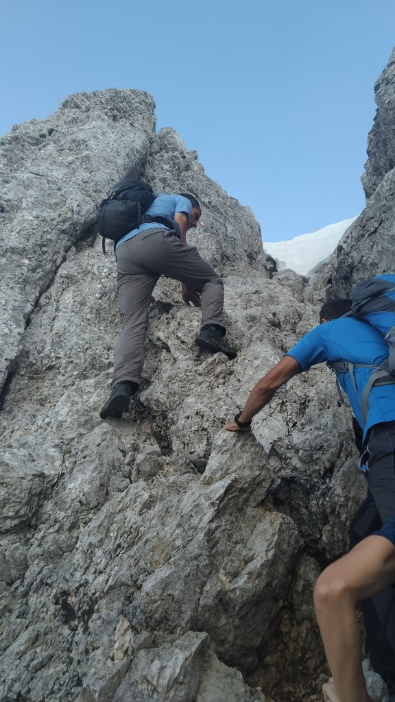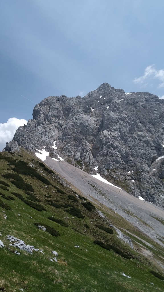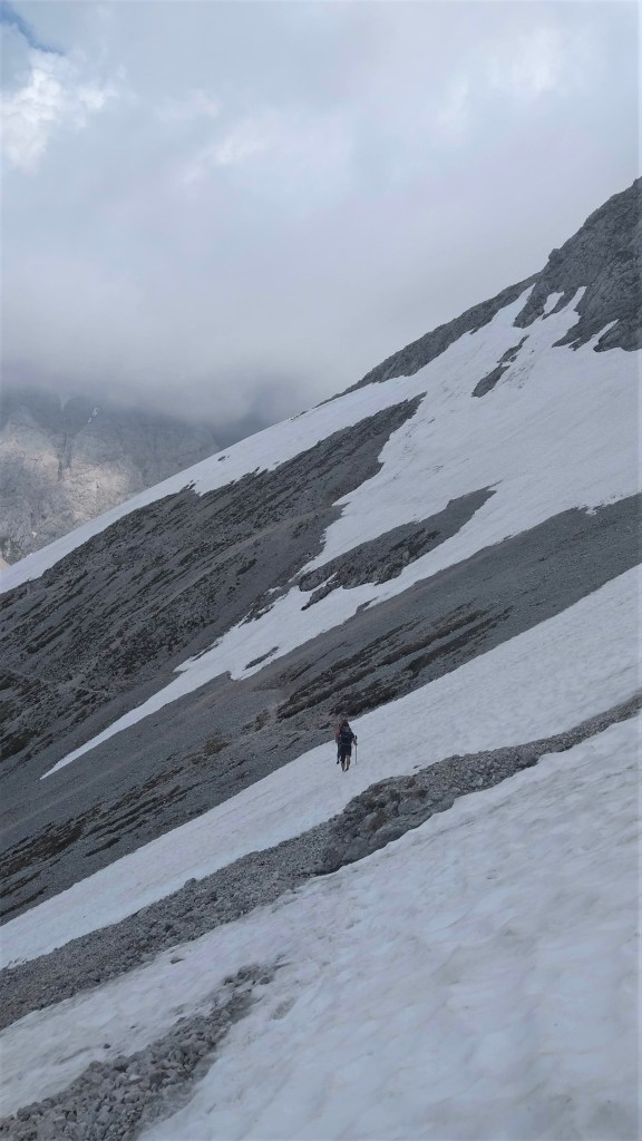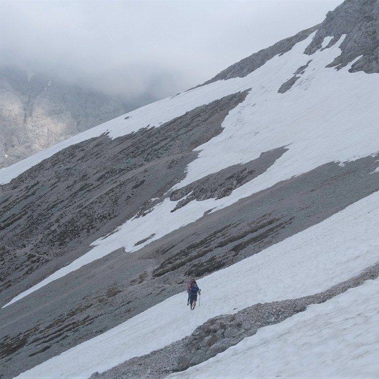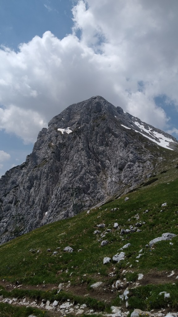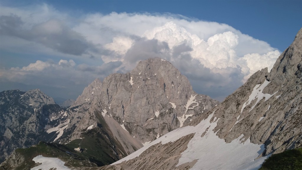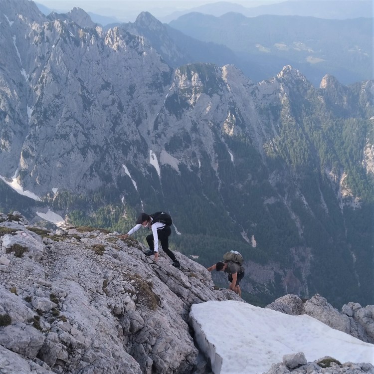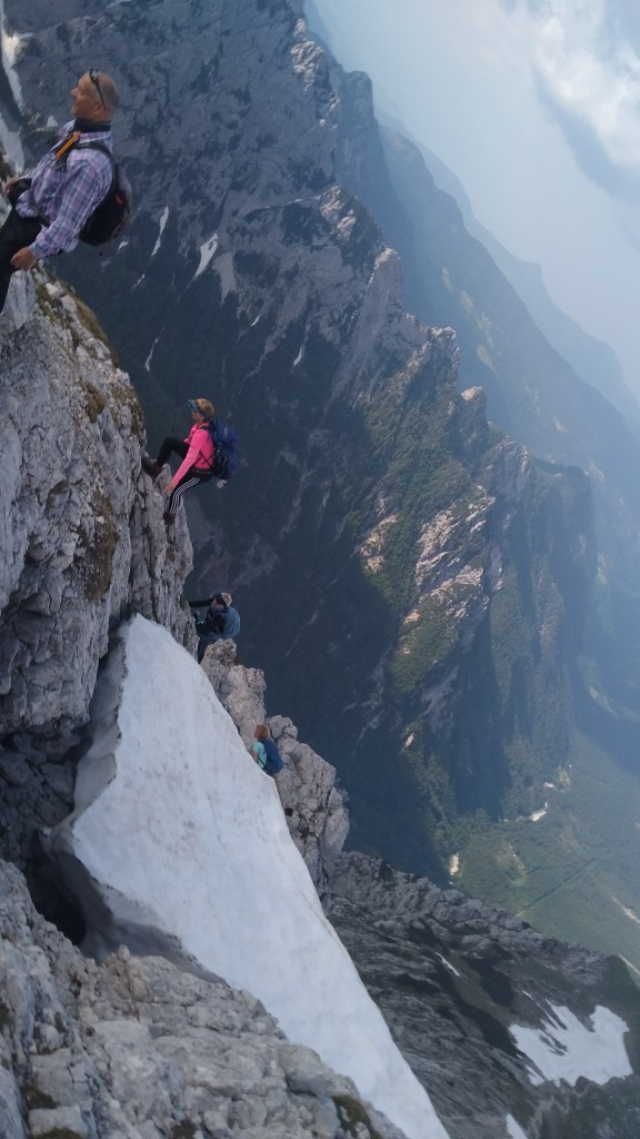 Preko zelenih livada i alpskog cvijeća dolazimo do dionice mekog snijega. Stavljamo dereze i oprezno prelazimo. Slijedi jednako nezgodan sipar. Do nas jasno dopiru zvuci pjesme Dao bi sto Amerika Jasmina Stavrosa iz Logarske doline. Dobro da nekim čudom ne nastupaju Rolling Stonesi jer bi njihov zvuk mogao pokrenuti kotrljajuće kamenje pa bi nam bilo Rolling, rolling, rolling on the river i što bi onda od Brane ostalo :)?! Hvala Bogu da smo se dočepali stijena, mada krušljivih, da se uhvatimo rukama. Ima par metara sajle, nekoliko klinova, jedan dimnjak zatrpan snijegom gdje smo se provukli između stijene i snijega jer se tu otopio. Izlazimo na prostran vrh obilježen stiliziranim metalnim križem, a dovoljan da bacamo frizbi jedni drugima. Oblaci ovdje brzo putuju. Od otvorenog pogleda na sve okolne vrhove – Planjava, Ojstrica, Mrzla i Turska gora do – sve je bijelo i nićeg nema osim nas.