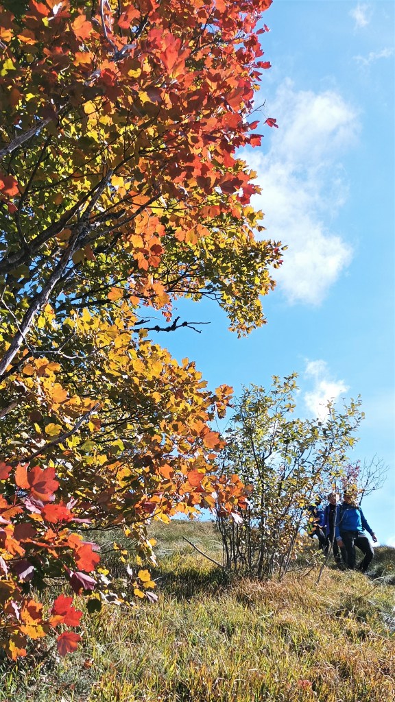 8:30 Puno planinarskih staza ovdje započinje. Danas se penjemo prema Crnom vrhu. Uzbrdo idemo. Strmo je. Šuma je zeleno-žuta. Prevladava bukva. Zaklonjeni smo od vjetra. Šušti lišće. Miriši jesen. Malo je gljiva ove godine, valjda jer nije bio kiše. Nema ni ciklama. Gledam vrhove na suprotnoj strani.  Njih smo obišli u proljeće. Trava je bila jednako suha.