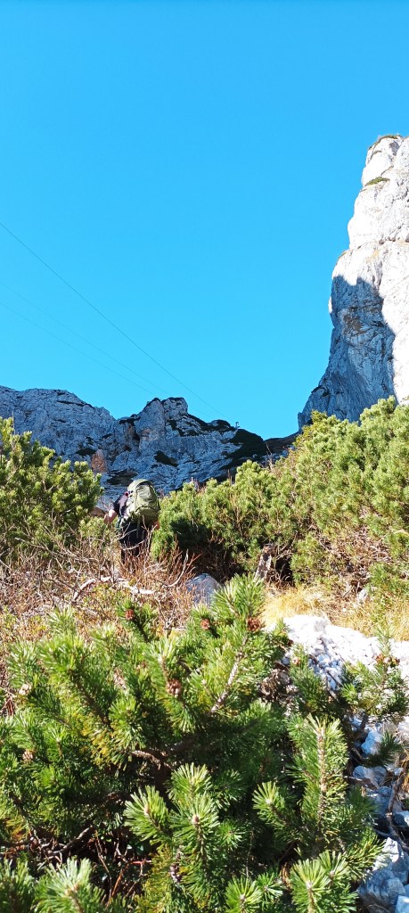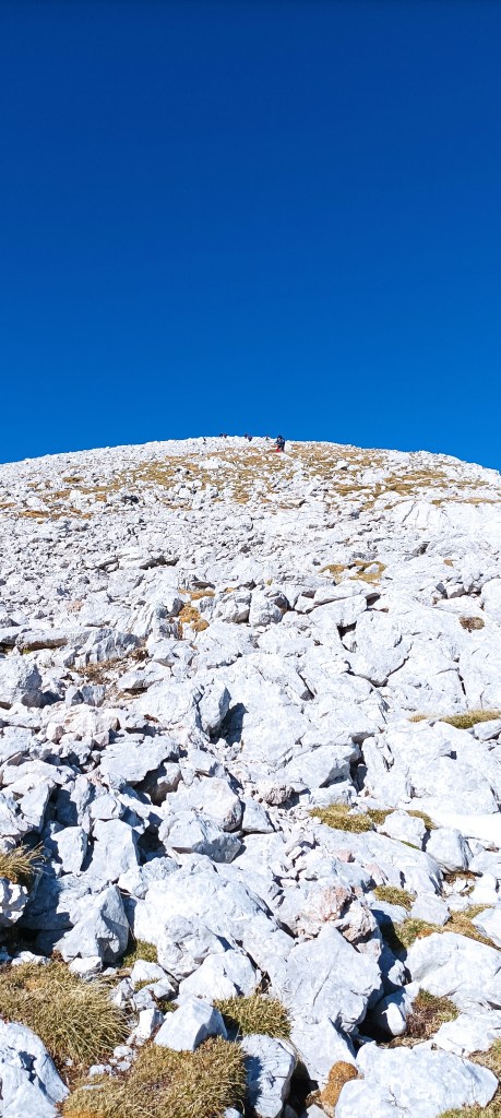 Kako to uvijek biva šumsku stazu smjenjuje kamena, uspon je konstantan, sve je više odjeće u ruksacima, a sve manje na nama, rečenice su kraće, a disanje brže. Stabla su otpustila sve lišće, ptice se ne čuju, nijednog cvjetića nema uz put, tek zelena klekovina i plavo nebo daju dinamiku ovom prostoru. Konačno sam kupila mijeh da mogu piti vodu bez stajanja, ali sam došla bez majice kratkih rukava i prevruće mi je. Čujem poznate glasove iza sebe. Okrećem se. To su Mateja i Denis, kolege iz društva koji su se sami zaputili na Grintovec, ali po sjevernoj zasniježenoj strani. Sretno im!