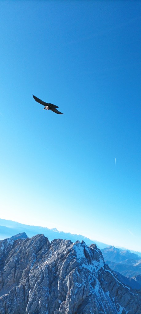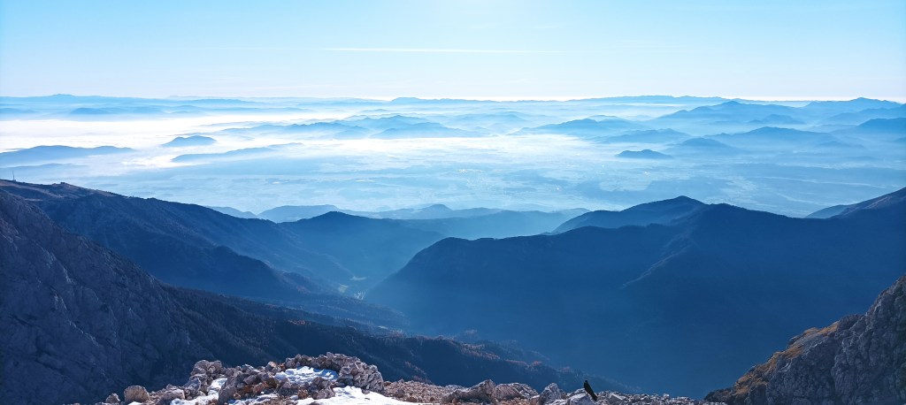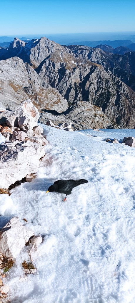 13:30 Granitni stol na vrhu nije šank, to je ruža smjerokaza i pokazuje koje vrhove možemo vidjeti u kojem smjeru. Lijepo se vidi Triglav, a uz malo mašte i Grossglockner. Dolijeću nam planinske kavke – najmanje iz porodice vrana. Nemaju nikakvog straha od nas i rado jedu sve što i mi. Odgovara im moja bučnica, a i meni. Volim ponijeti nešto posebno od hrane da trenutak pamtim i po tome.