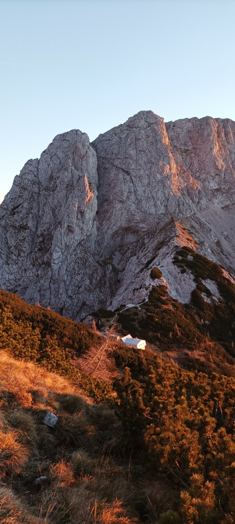 10:30 Cojzova koča na Kokrškom sedlu je zatvorena u ovo doba godine, osim zimske sobe s 12 kreveta. Slijeva je Kalška planina, a zdesna naš današnji cilj Grintovec. Iza se naziru Jezerska i Kokrška kočna. Osjećaj pentranja po njima, sate i sate na sajlama krušljivih stijena neću nikad zaboraviti – vjerojatno niti ponoviti. 😉 Osim ako ipak ne zaboravim.