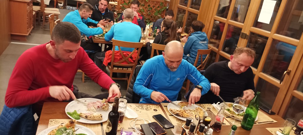 Nakon detaljne provjere osobnih iskaznica i Covid putovnica bilo nam je dozvoljeno sjesti, ali ne za isti stol. To nikako. Pizze su neobično voluminozne i za svaku preporuku. Na mojoj vegetarijanskoj bila je hrpa svježeg špinata.