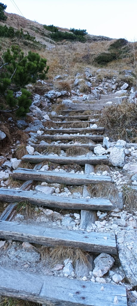 Prema Kokrškom sedlu idemo. Strmo je postalo strmije. Teško je, no navikla sam da je tako i nemam potrebu odmoriti se. Stanem tek zbog poneke fotke i da pogledam kakav je pogled unazad. Blizu je Brana, zadala nam je dosta briga u proljeće zaostalim snijegom. Svatko ide svojim tempom. “Sjećaš se Konja, Ane?”, pita Dubravko i pokazuje rukom planinu u obliku konja. “Kako bih zaboravila klimavi sajlani put nakon kojeg je slijedio uspon na Ojstricu i povratak do auta u ponoć?!” Smijemo se. Iskustvo i sjećanja. Vesele me drvene stepenice postavljene na nekoliko mjesta. Daju mi osjećaj dobrodošlice u ovaj zapravo negostoljubiv svijet opasnih alpskih divova.