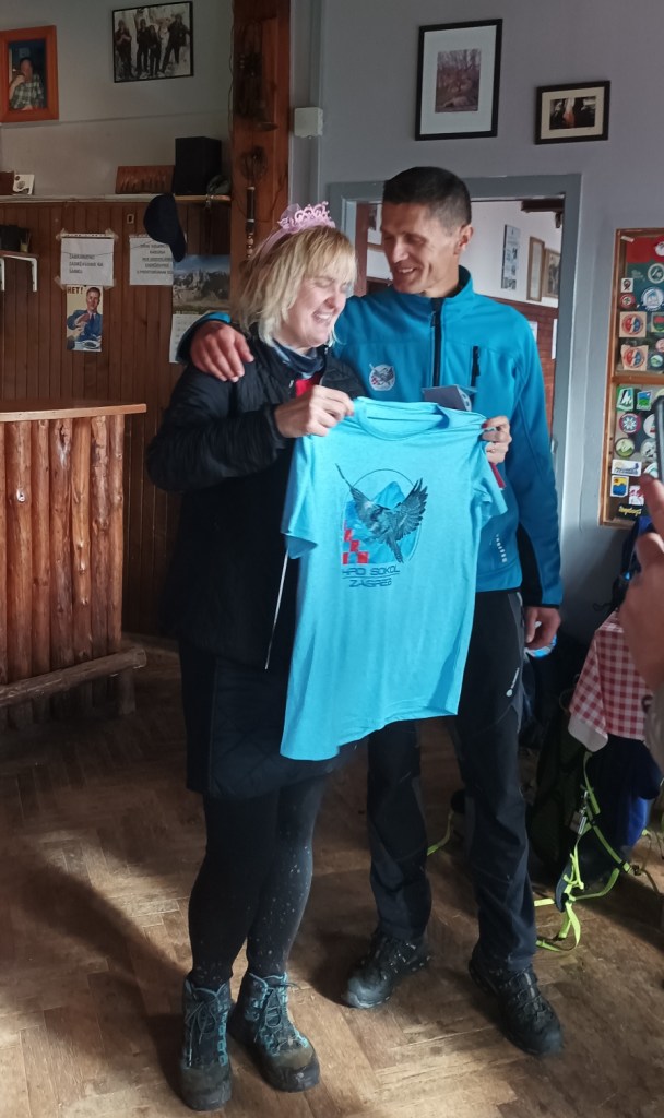 10:30 Kavica mirisna vruća u domaćoj atmosferi planinarske kuće Risnjak. Sad Jurica vadi Jasminkin kolač iz svog ruksaka, a prilika je i za predati poklon slavljenici. Čast pripada šefu. Tu je kupon za specijalnu masažu, majica društva i čestitka u stihu by Srečko – to čuvam za kraj! 🙂