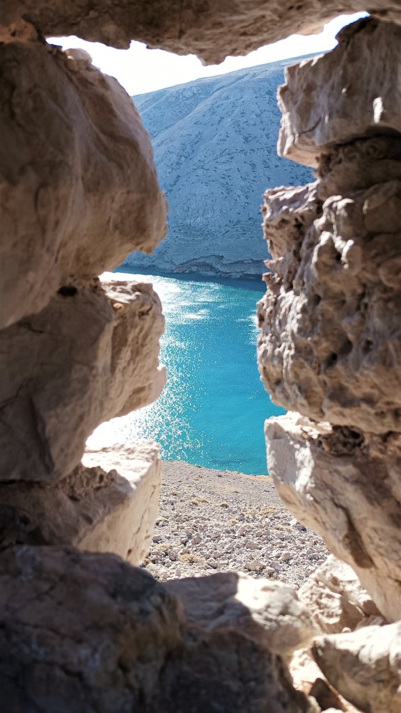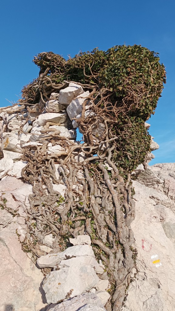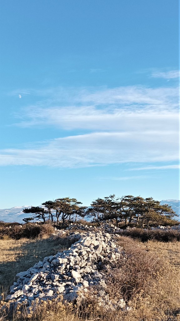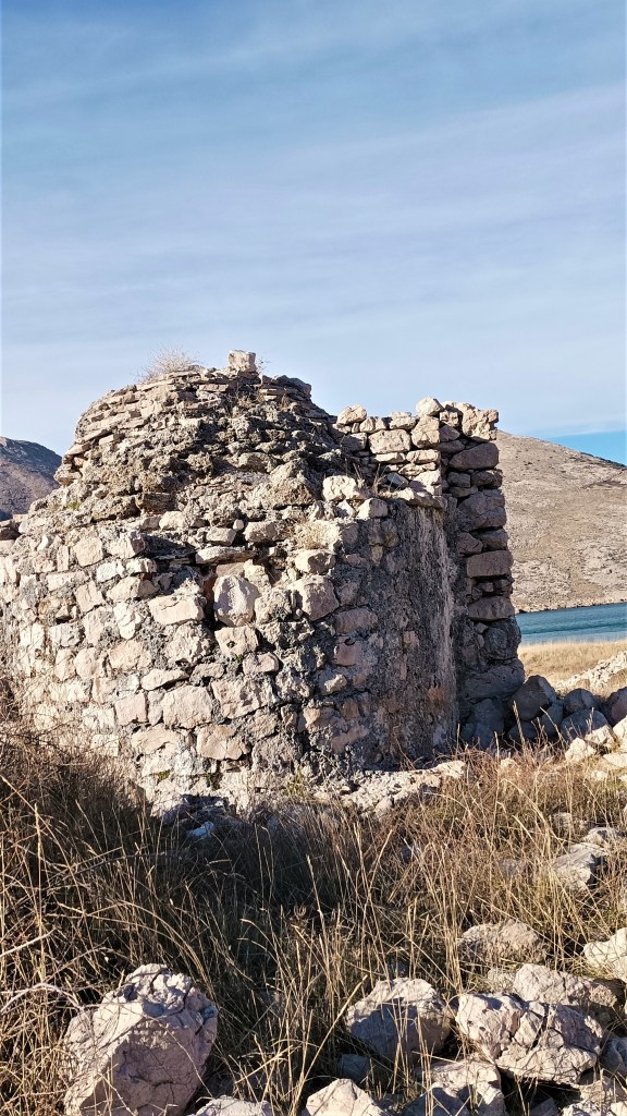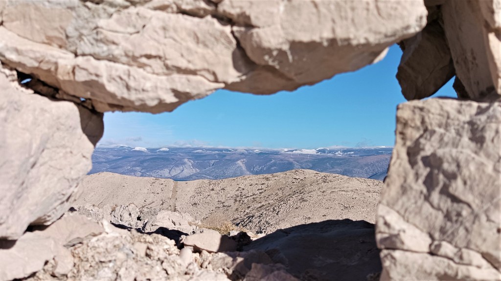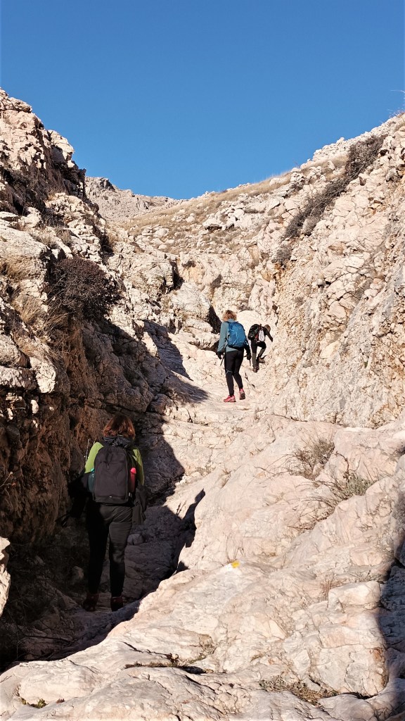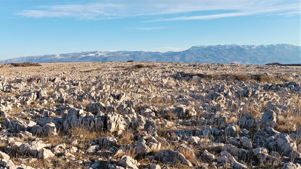 Izlaskom iz kanjona ogrnulo nas je sunce, uskoro će i bura, ali nema veze. Sredina je prosinca i vrijeme savršeno. Lagano napredujemo krčkim kamenjarom. U daljini zasniježeni vrhovi Velebita zadržavaju oblake. Ispod nas dvije uvale Mala i Vela Luka.