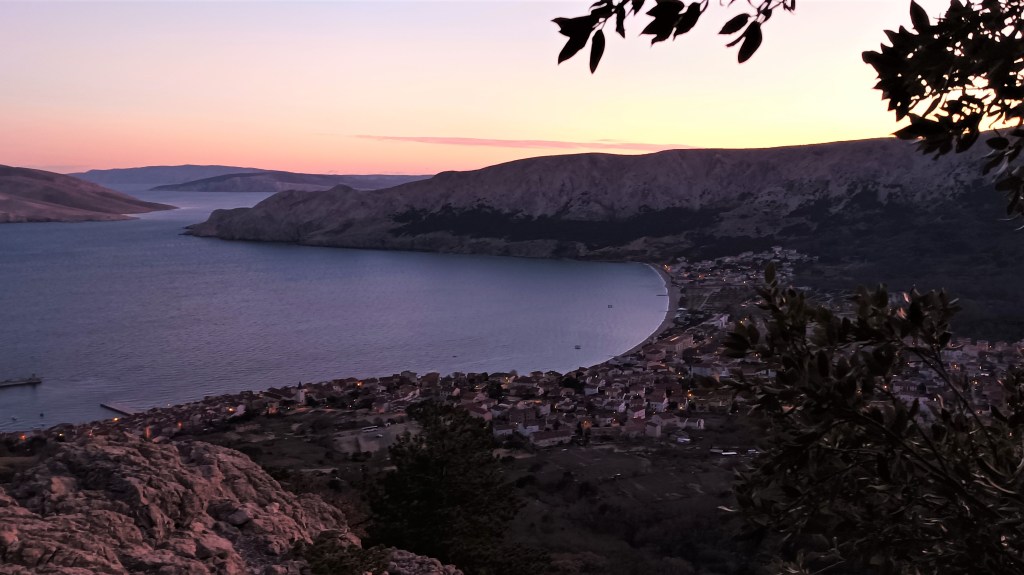 Baška na vidiku! Spušta se noć… Na nekad bašćanskom kaštelu na brdu Sv. Ivana sad je Crkva Sv. Ivana Krstitelja i pomalo neobično staro groblje. Pravo je vrijeme za obići ga. Ispod velikog križa zapisana je misao: “Pazi na stazu kojom kročiš i neka ti svi putovi budu pouzdani.” Hm, a meni draga misao je: “Brod je siguran u luci, no je li to svrha njegovog postojanja?” Uzet ću od obje pomalo.