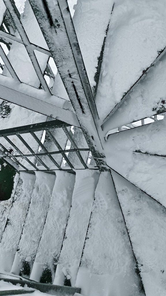 Još nisam nikad došla na Japetić, a da se nisam popela na razglednu piramidu pa neću to ni danas propustiti iako su metalne stepenice skliske od snijega i leda. Piramida je visoka 12m. Preseljena je s vrha Medvednice 1960.g. kad je tamo sagrađen televizijski toranj.