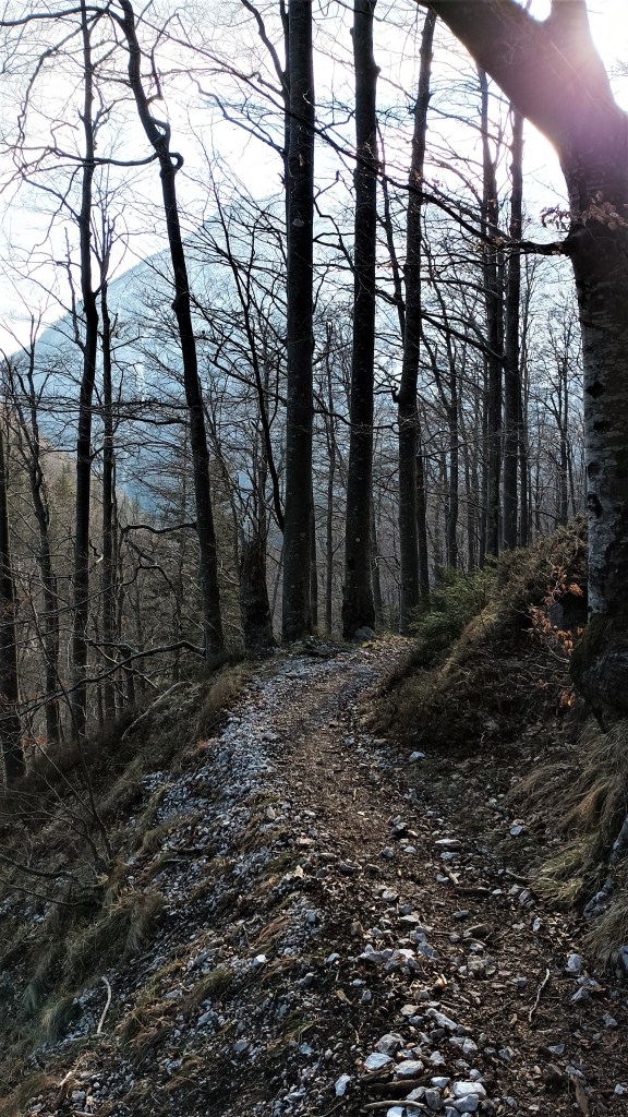 7:45 Ulazimo u šumu stazom urednom, tužnom, bezbojnom. U ruksaku kompletna zimska oprema (3,5kg) za mogućnost uspona na Branu ili Planjavu ako uvjeti budu dobri ili samo za jačanje tijela, vidjet ćemo. Kasnije će se pokazati da mi je dodatni teret najkorisniji da me vjetar ne odnese.