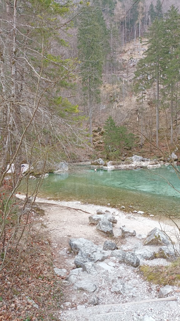 Odmah je tu i jezero iz kojeg izvire rječica Kamniška Bistrica – popularno kupalište tijekom cijele godine. Ne šalim se i ne pretjerujem. Postavljena je tabla s molbom da se ne kupamo jer time mijenjamo mikrobiološki svijet i utječemo na život u vodi. U najtoplije ljetne dane temperatura vode dosegne iznimnih 6°C. Po principu “što te ne ubije, ojača te”, svoj imunitet i samopouzdanje jačaju i sada dvojica muškaraca. Kakav je to osjećaj ne želim nikad saznati. Nakon Brane prošlo ljeto umočila sam iscrpljena užarena stopala i bilo je to bolno ledeno iskustvo. Iako je umor sasvim nestao – nisam to više ponovila.