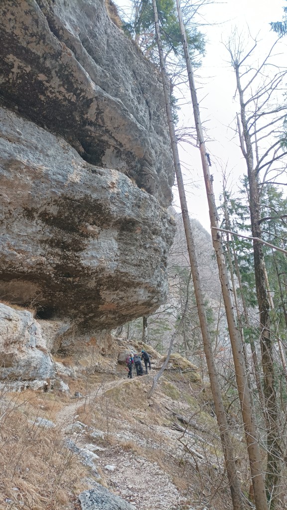 O, već smo kod moje omiljene stijene. U lipnju je sve bilo zeleno, a sad je šuma prozračna, anemična, a visoka stijena još moćnija.