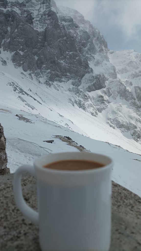 Nadala sam se tanjuru vruće juhe da mi posluži za tečaj fotografije, ali danas nemaju hrane. Uzimam kavu, no mlaka je i ne daje željeni dojam isparavanja. Izlazim van. Hrabro izlažem svoje krhko tijelo nemilosrdnim udarima hladnog sjevernog vjetra da snimim kavu s Planjavom u pozadini, a mogla sam sve to i iz toplog doma odraditi.