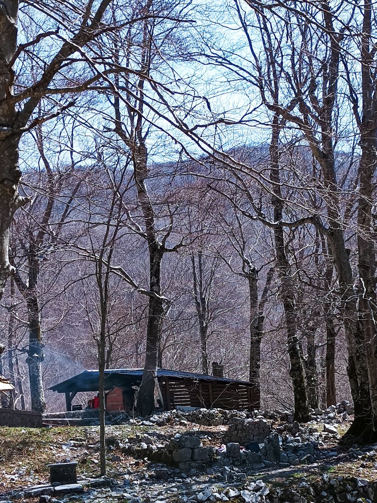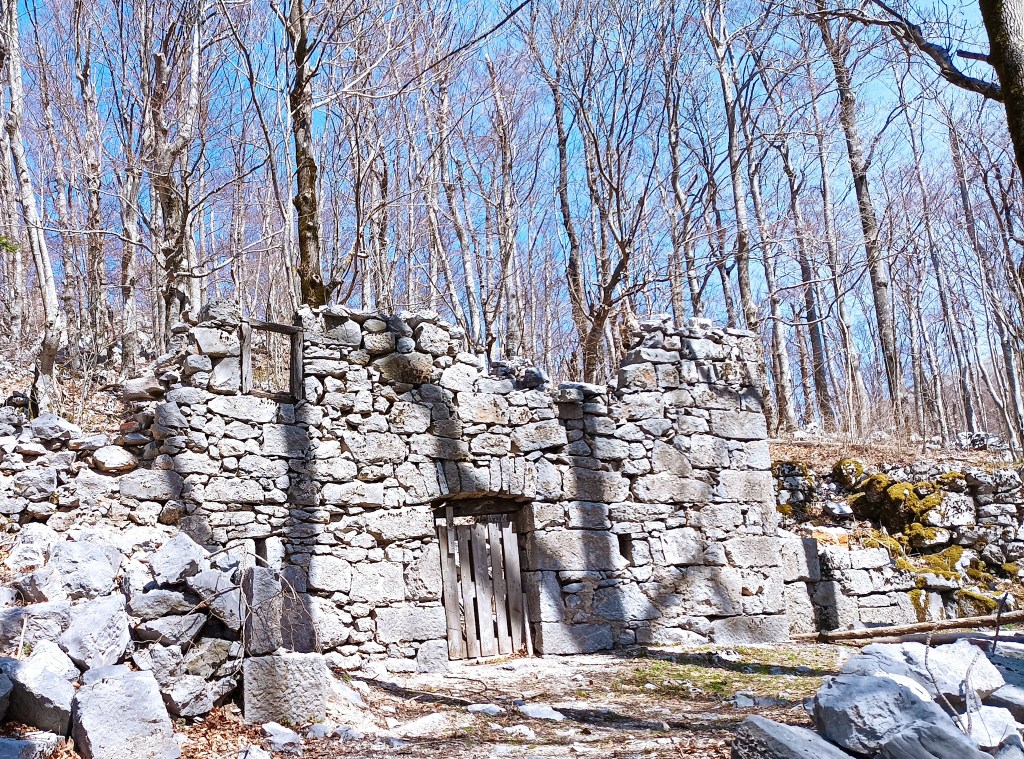 Malo kroz bukovu šumu i opet ostaci pastirskih stanova. Zaseok Skorpovac na Premužićevoj stazi.