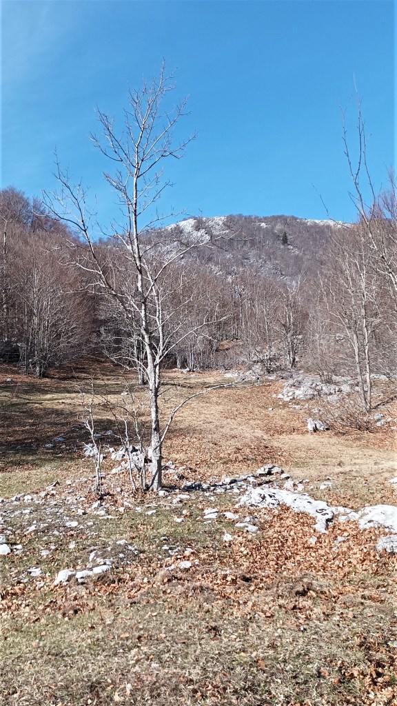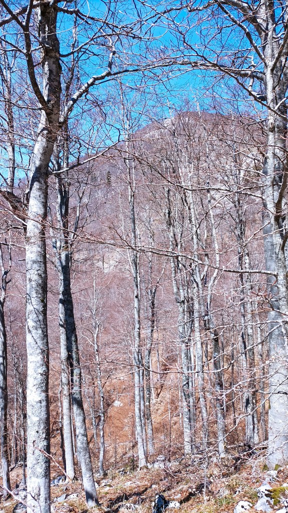 Uspon je konstantan i dobro markiran, no pojedini su znakovi zatrpani lišćem. Uživam u šumskom prostranstvu bez gojzerica u prvom planu. Inače tražim detalj za fotografiju, a sad me samo crveno bijele marke zanimaju. O, medvjeđi luk! Tome sam se nadala, a brat ću ga u povratku. Strmi uspon po nagomilanom lišću, bit će sklisko u povratku. Na travnatom vrhu smo za 45 minuta i gledamo Šatorinu.