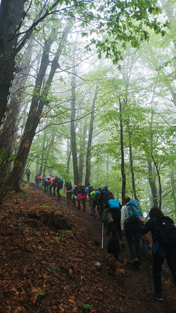Vijugamo tako uzbrdo nas 50-ero i 4 psića prema vrhu Brestovac (862m) šumom obojenom u najintenzivniju boju tek razvijenog lišća ujednačenim korakom, složno.