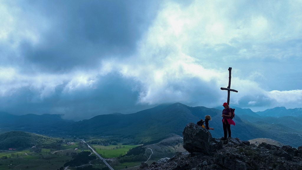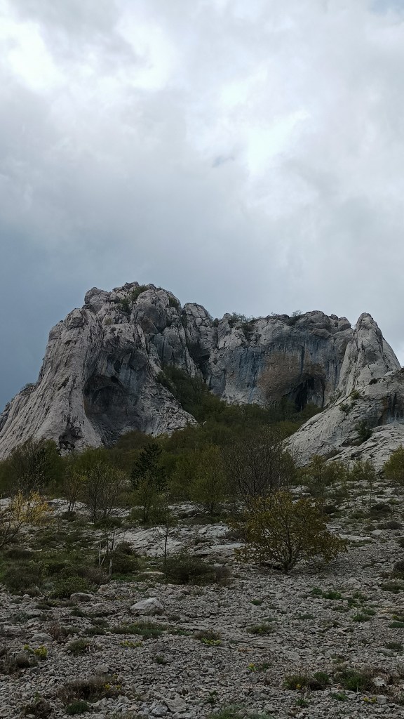 Vrijeme je oblačno i vjetrovito, a to je zapravo idealno za hodanje, puno bolje od vrućine. Sunčane naočale su tu da nas štite od vjetra, ne za stilski dojam. Iza nas su Dabarski kukovi. Njih još nisam u cijelosti prošla, a voljela bih.