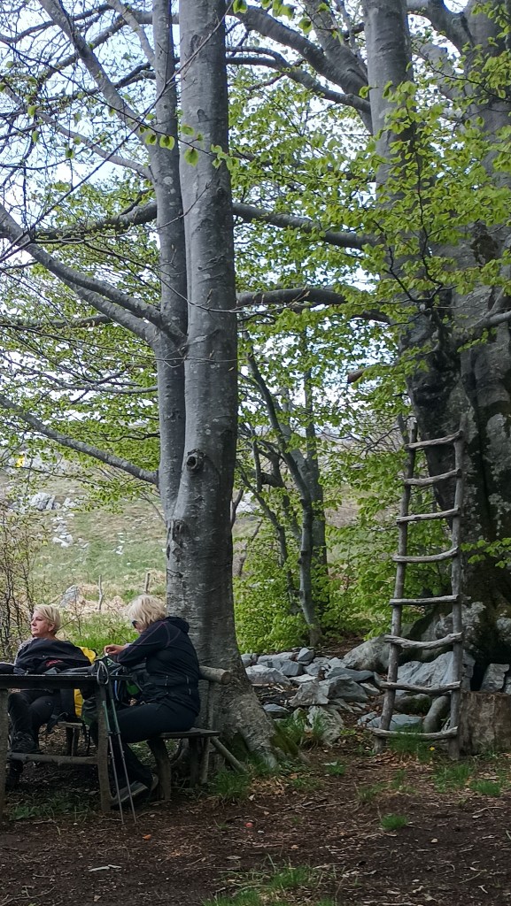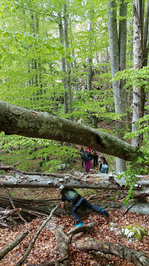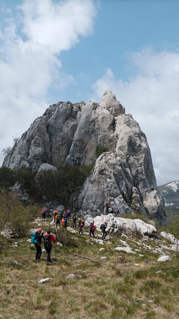 Idemo dalje…Nove misli potiskuju stare, uspon je. Treba se iz doline popeti na prijevoj Alaginac. Rado bih fotku na istom kamenu kakvu imam iz prosinca – to mi je fora, ali ništa od toga. Počela je lagana kišica i nije mi do zadržavanja na tom posebnom kamenu. Kratko je kišilo. Pokazali smo i pospremili kabanice. Ovaj tjedan tema predavanja u planinarskoj školi bila je obavezna oprema. Tako je iz pokaznog ruksaka na stol izvađeno i ponešto što nije s polica planinarskog odjela, ali pošto je siguran boravak u prirodi na prvom mjestu tako je i zaštita svake vrste dobrodošla! 😉 U autobusu smo pak vježbali vezivanje užetom – čvorove. Već vidim da će to biti kvalitetno osposobljeni planinari!