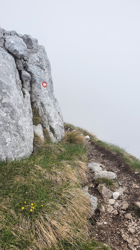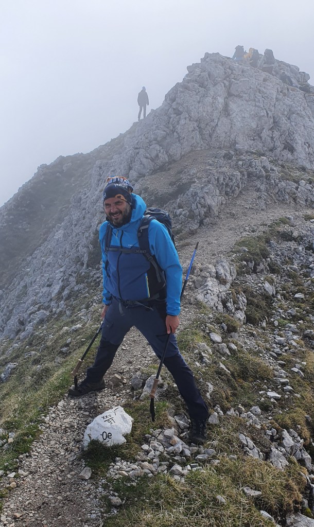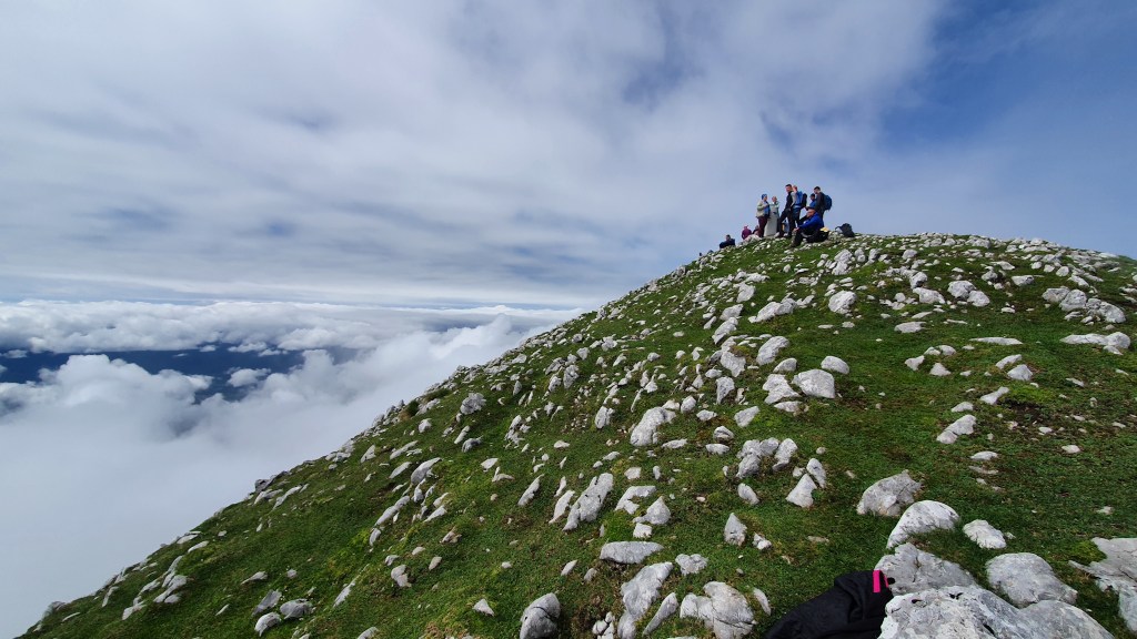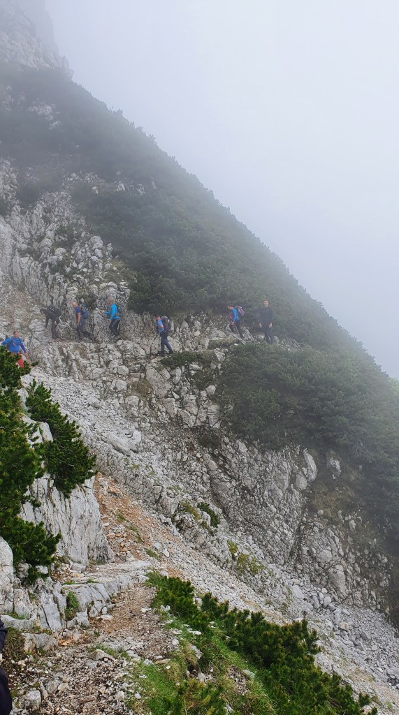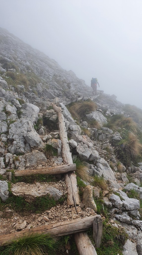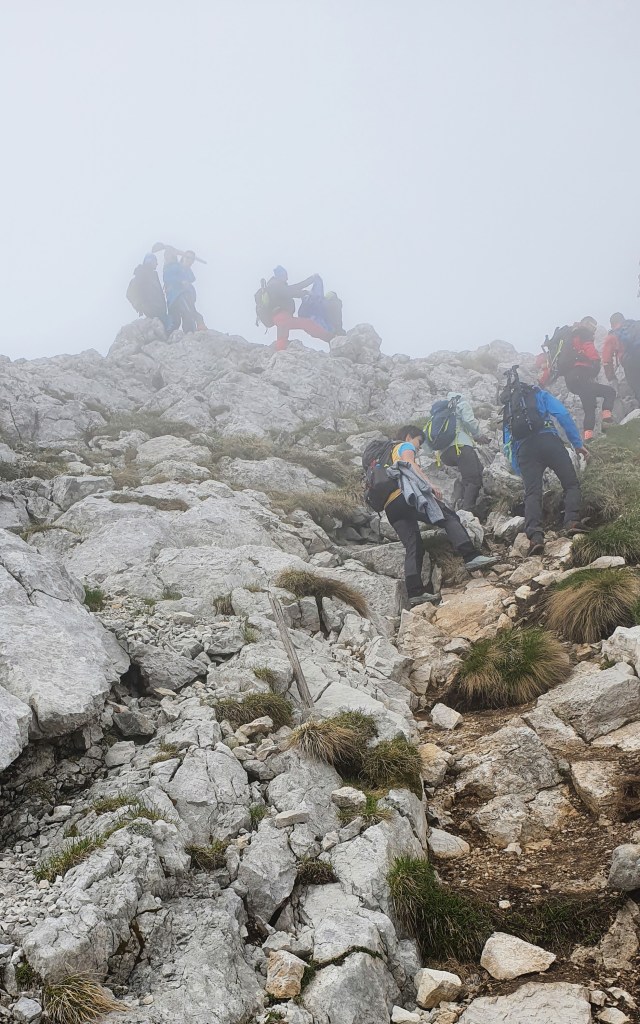 10:30 Prema vrhu Begunjšćice magla svuda magla oko nas, a mi se probijamo kroz nju jednostavnim puteljcima, blagim usponima sa živim sjećanjem na spust ovom istom stazom prije dvije godine. Kosa mokra kao da smo se kupali i super je – lakše se diše nego da je sunčano.
