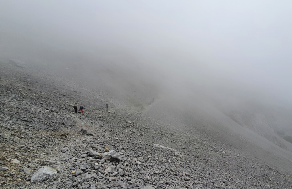 15:00 Kroz šumu, kroz klekovinu, u magli, u znoju strmu stazu smjenjuje još strmija. Tek kratki predah izohipsom preko sipara.
