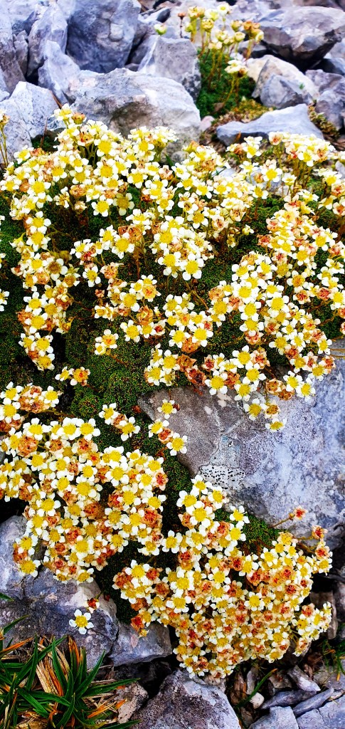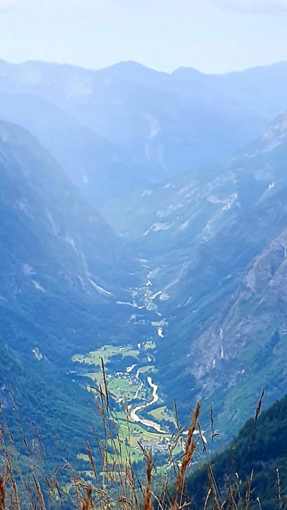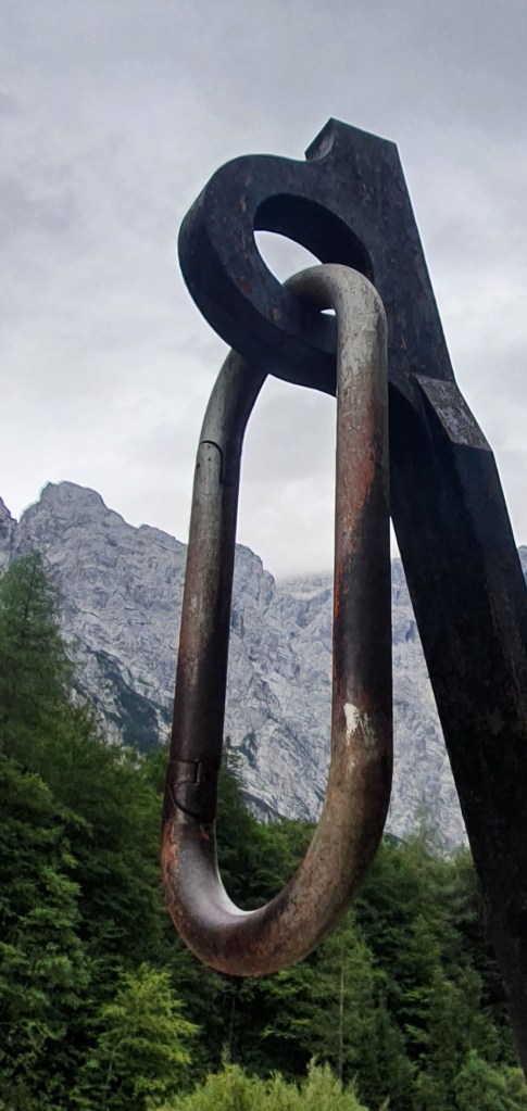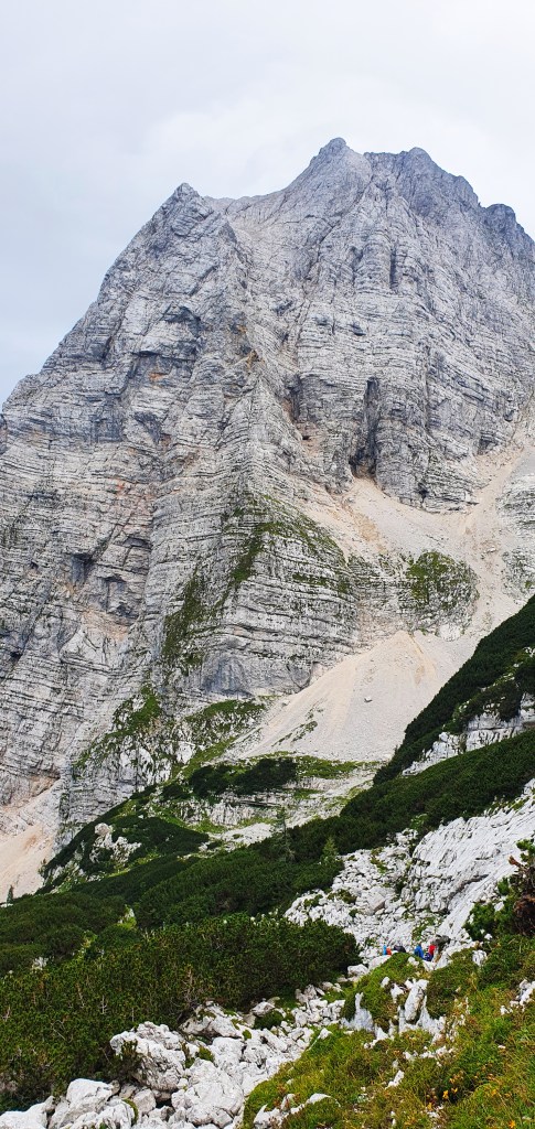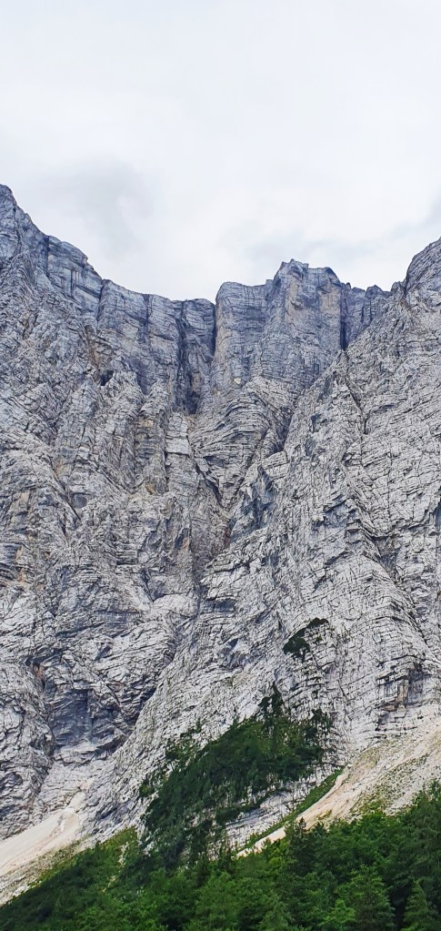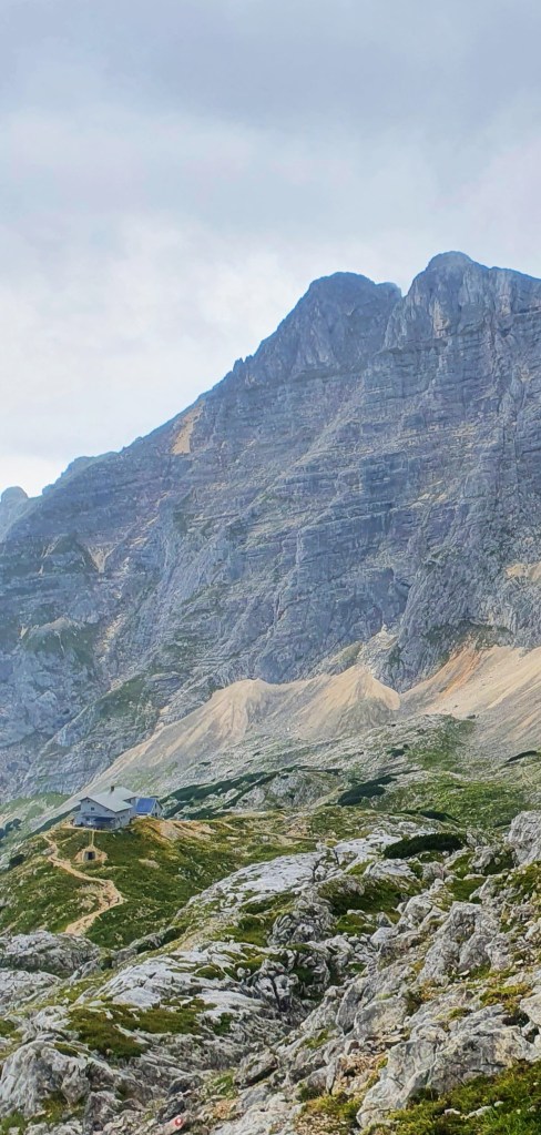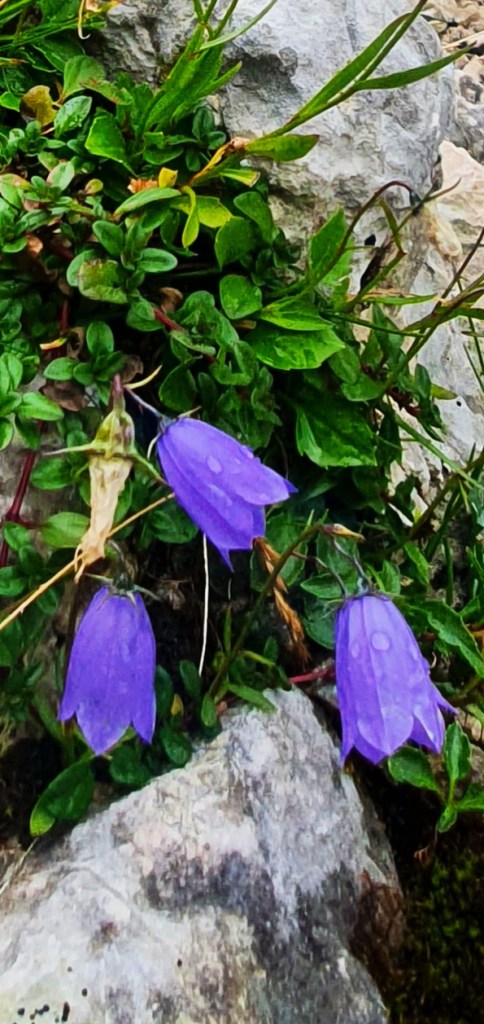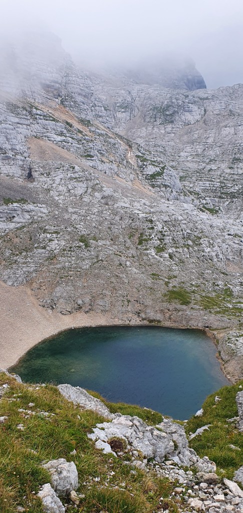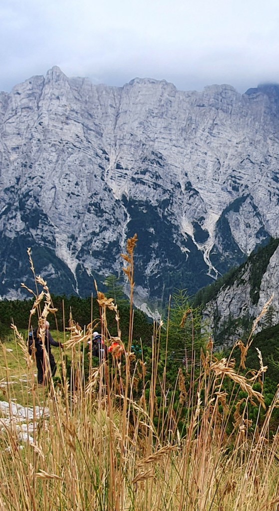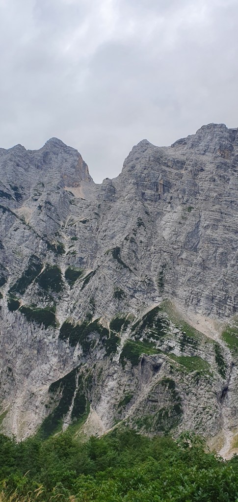 a iznad divovi Julijskih Alpa : Planja, Razor, Križ i Stenar, danas prekriveni oblacima. Zapravo i lani smo ovdje bili u oblacima…Hmm, valjda je ovdje uvijek tako. Kad poželim živjeti u oblacima – doći ću ovdje!