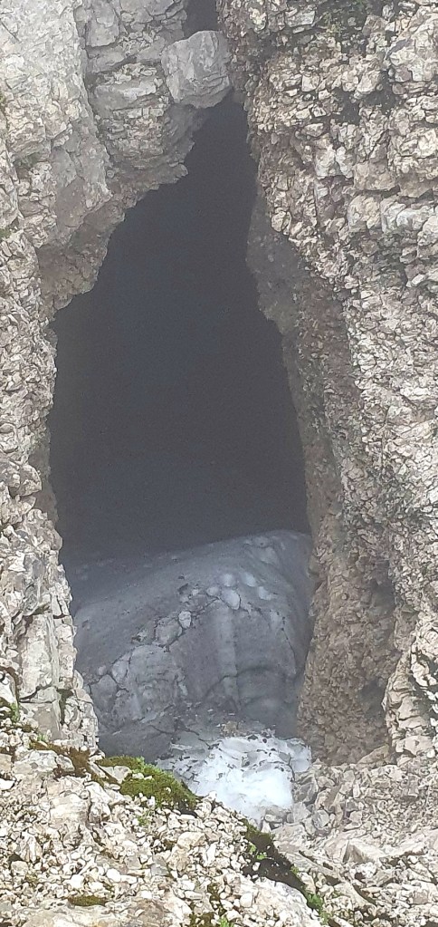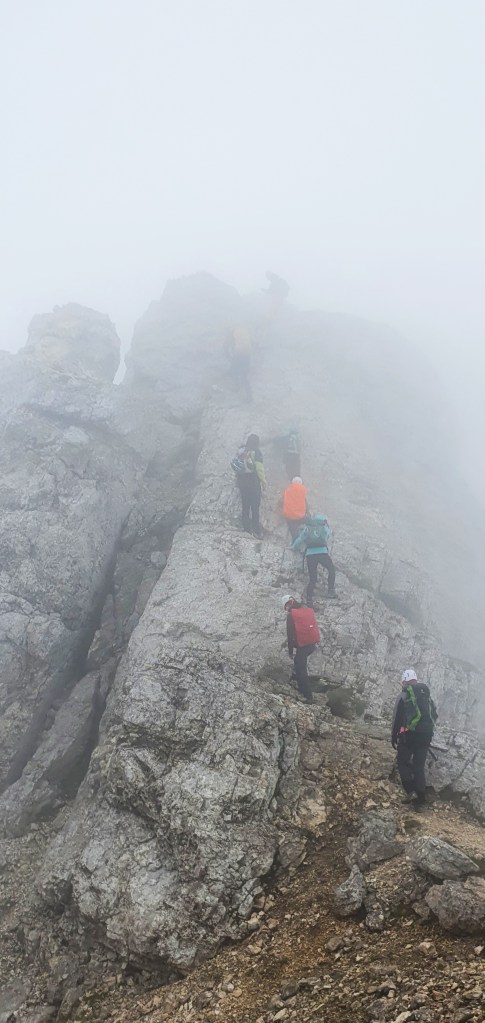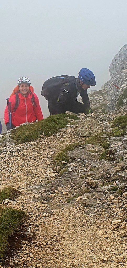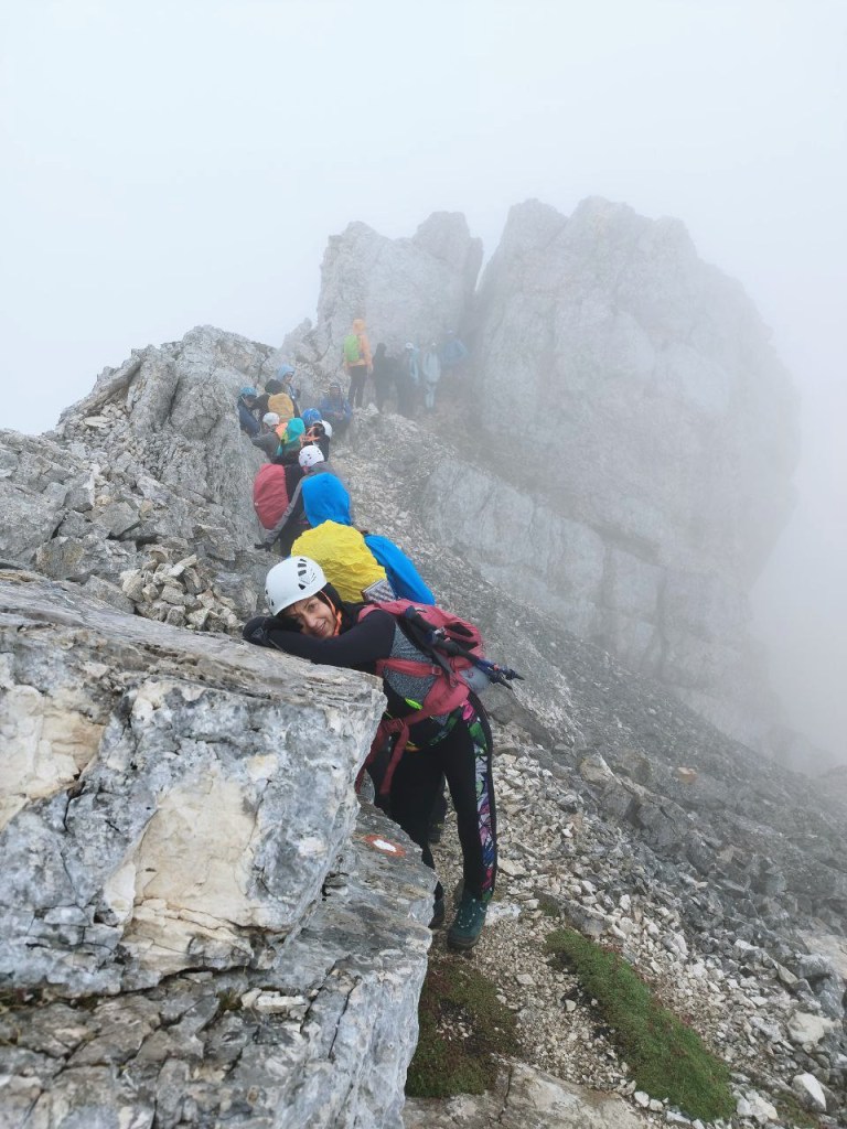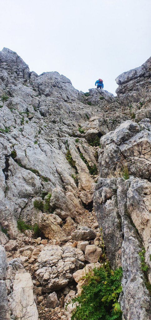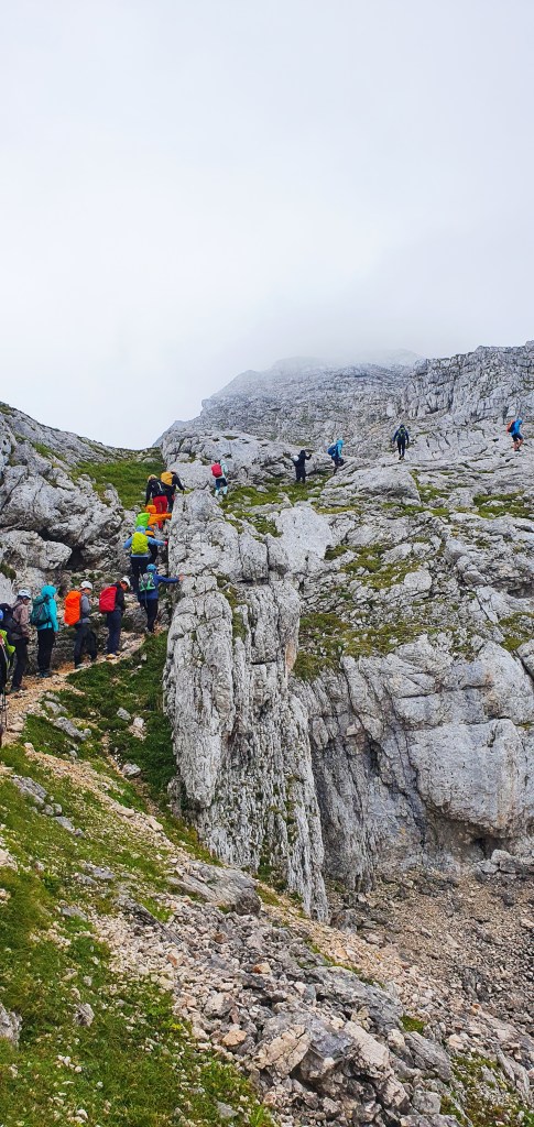 I tako do Bovških vrata kad se pogled sveo na metar ispred sebe – malo zbog četveronožnog kretanja, malo zbog gustog oblaka u koji smo ušetali. Izgleda kao da se penjemo po oblaku, ali nije, po stijeni se penjemo.