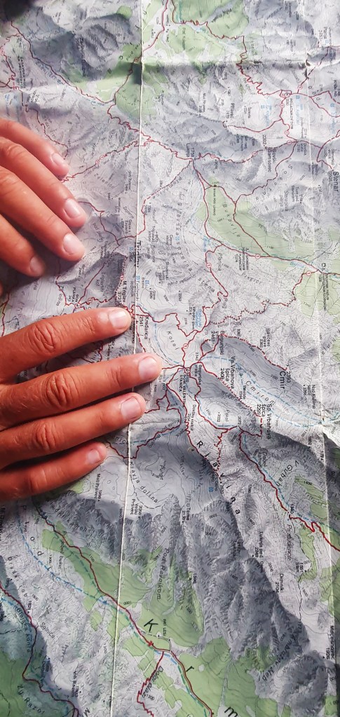 13:30 Blagovaonicu grije kamin premda je ljeto i pretoplo nam je. Stisli smo se oko jedinog slobodnog stola u domu i nadvili nad topla variva i slasne kolače, samo se šef nadvio nad kartu. Vani lagano kiši i brinu ga klizave stijene. Hoda kao Baltazar, ali ne po prostoriji nego oko doma s prstom u zraku da procijeni smjer vjetra i kretanje oblaka. Mislio je, mislio i smislio! – “Idemo na Križ. Danas je preopasno za Razor.”