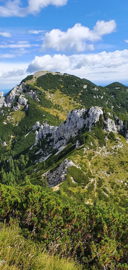 Malo se spuštamo i na Okrogleš (1965m) se penjemo kroz gustu klekovinu. Lijepo se vidi Debela peć odavde.