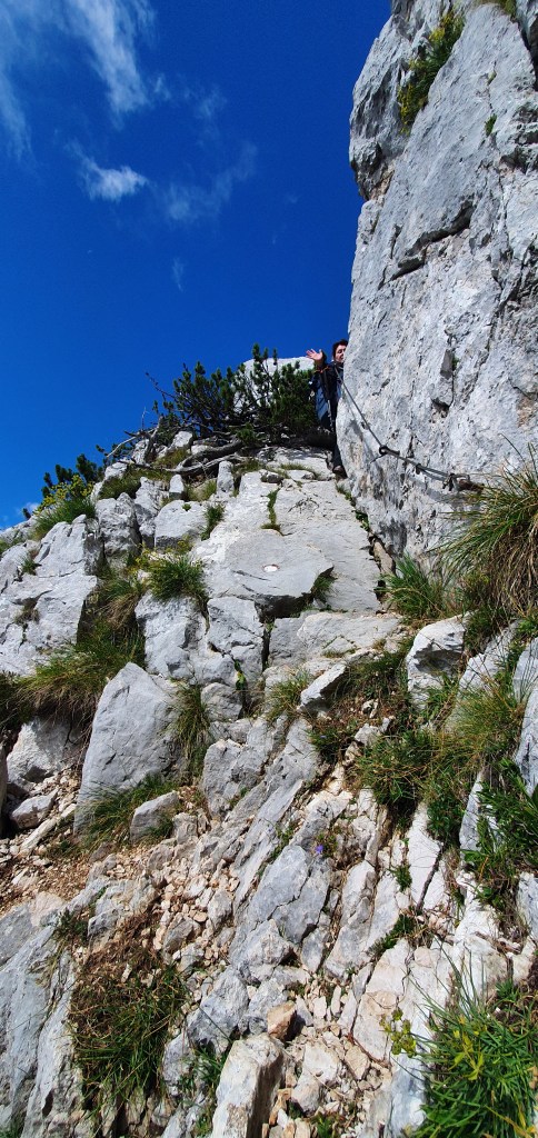 Nadalje grebenski put od Mrežce do Lipanskog vrha zahtjeva upotrebu ruku, a postavljene su sajle. Neki se odlučuju vratiti. Čudim se. “Ne idem ni ja dalje. Jesi vidjela kako je strmo?!”, govori Marijana. “Ma daj, ne može biti ništa strašno na ovom području. Ići ćemo zajedno i polako.”, govorim joj. “Idem onda.”