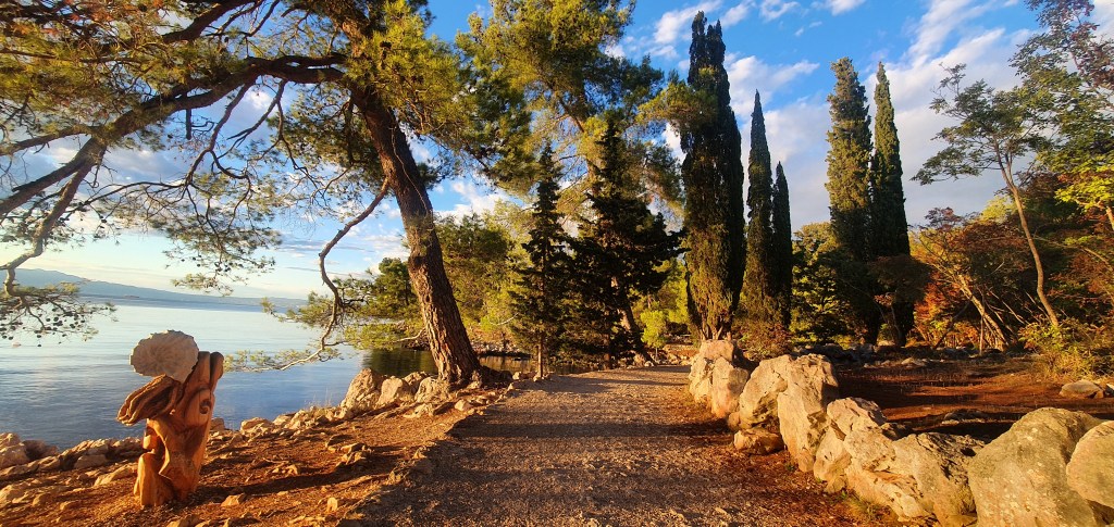 Iz Malinske krećemo Rajskom cestom prema Njivicama. Urbane plaže, Haludovo, lovor, borovi, pinije i meni najdraži visoki čempresi. Prije dvije godine prošla sam 100 km Camina i meni je ovo najljepši dio.