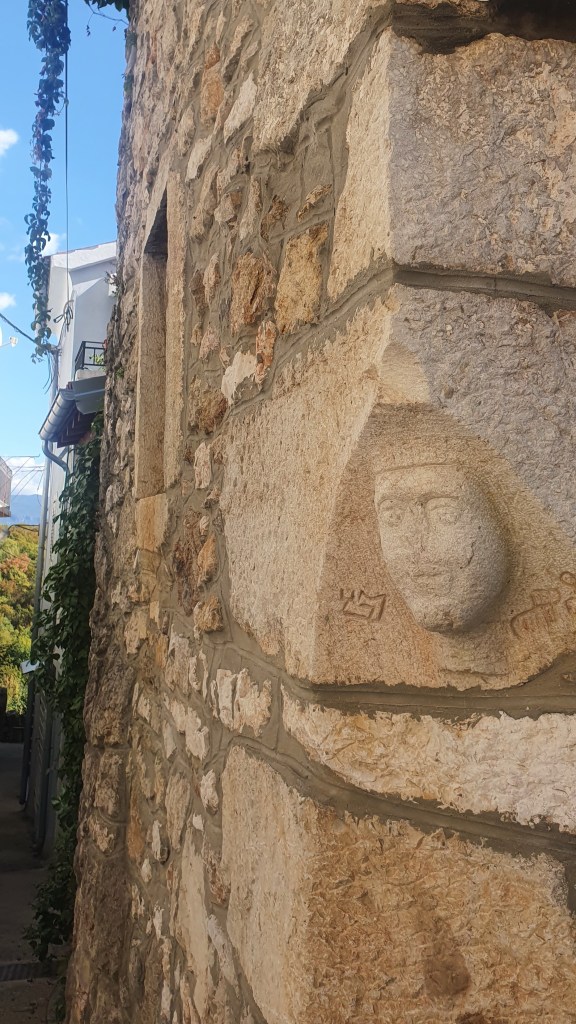 Svaki kamen ovdje priča priču. Ova muška glava je pučko klesarsko djelo iz 1738.g. “…ili je samo netko odvalio ugao kuće i vješto to zakamuflirao.”, misli D.