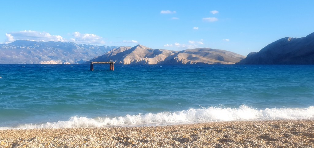 Bacamo se na vjetrovitu šljunčanu plažu Baške. Puno je ljudi. More šumi, vjetar zviždi, mladi slovenski glazbenici sviraju vesele polke, neki plešu, hrabriji se kupaju, a mi gledamo u daljinu umotani u jakne kao Britanci na svojim vječno hladnim plažama. Posebno je!