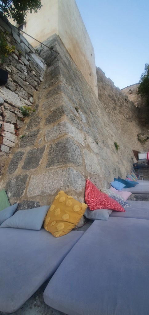 Čarolija unutrašnjosti u suprotnosti je s lounge barom na vanjskim zidinama istog kaštela. Ne vjerujem da bi ovaj barokni par sjedio na jastucima Ikea dizajna, pa nećemo ni mi.