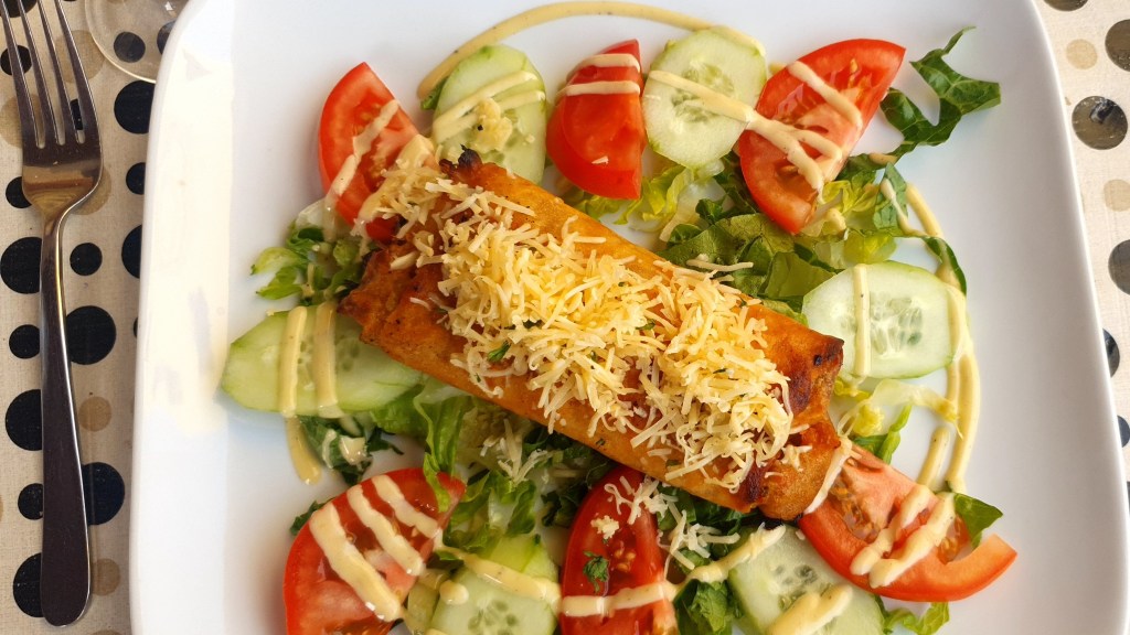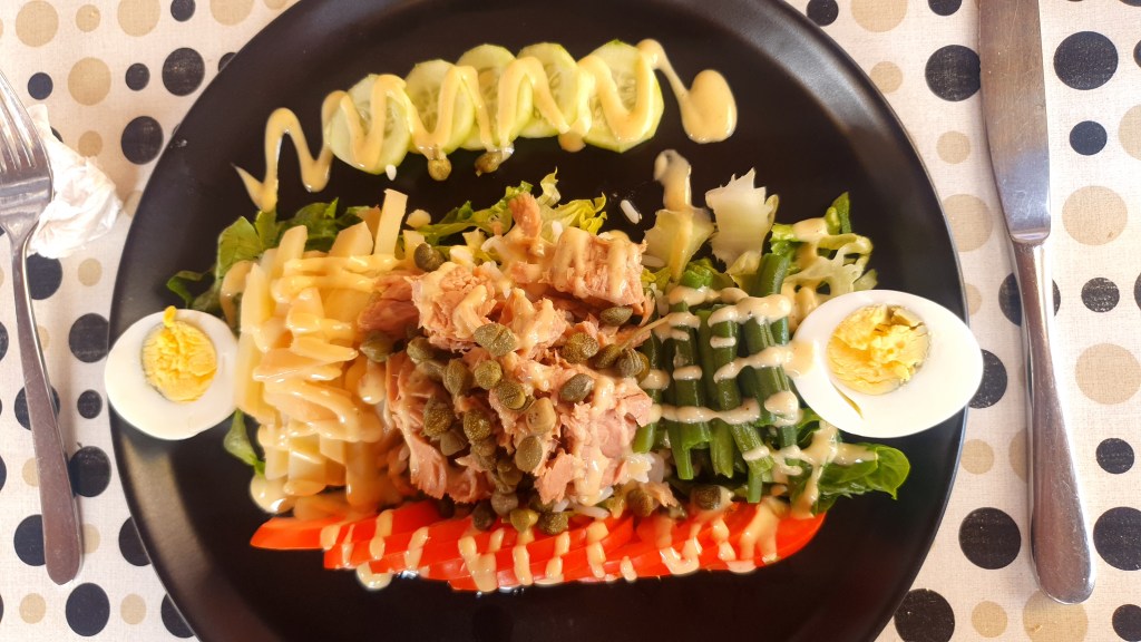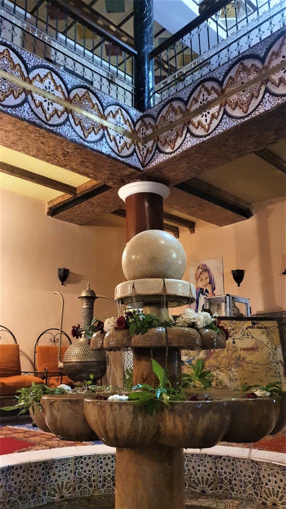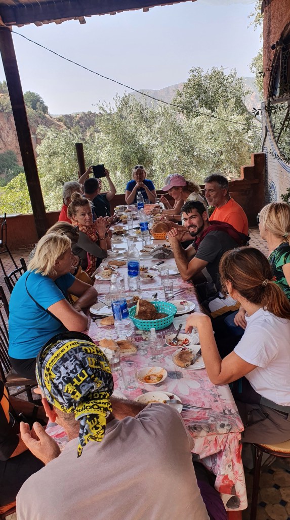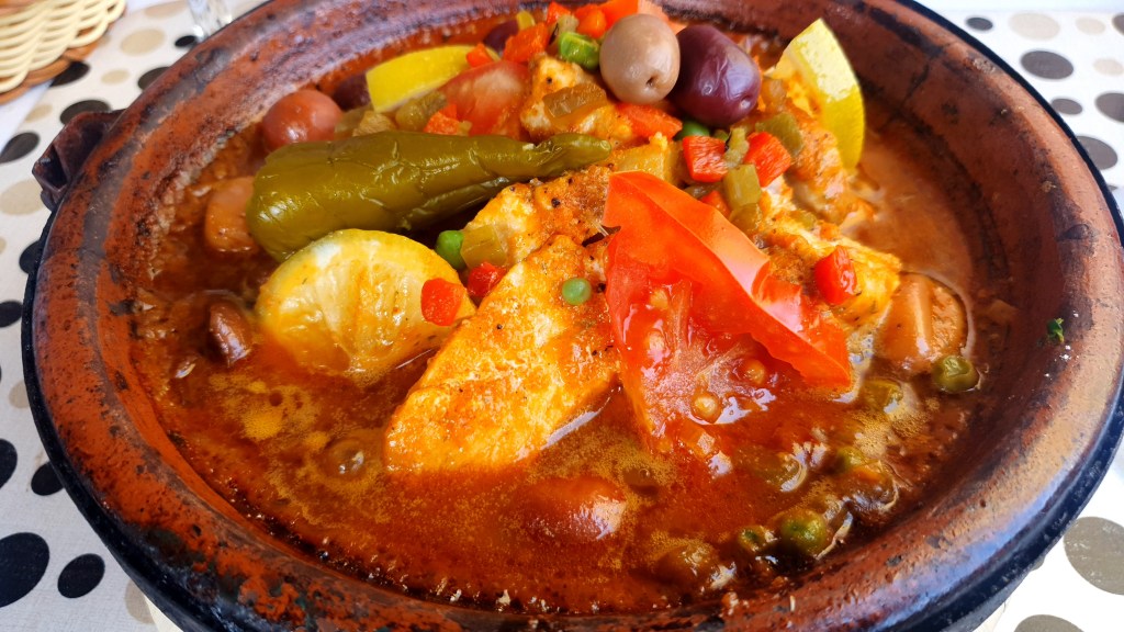 Za predjelo Marokanska salata (paradajz, luk, paprika, malo soli, bez octa, sve sitno nasjeckano), neizostavne masline – crne, zelene i s ljutim papričicama. Da mi se nije u životu dogodio Maroko nikad ne bih zavoljela masline! Za glavno jelo birali smo između vegetarijanskog tajina/tažina (pokrivena keramička posuda u kojoj se krčkaju krumpir, mrkva, patlidžan, grožđice, paprika itd) i kebaba, što su pileći ražnjići, te za desert voće. Na stol su donijeli nekoliko boca obične vode, a za kraj čaj od majčine dušice. Praznik za nepce u neprocjenjivom okolišu, a cijena prava sitnica (12€).