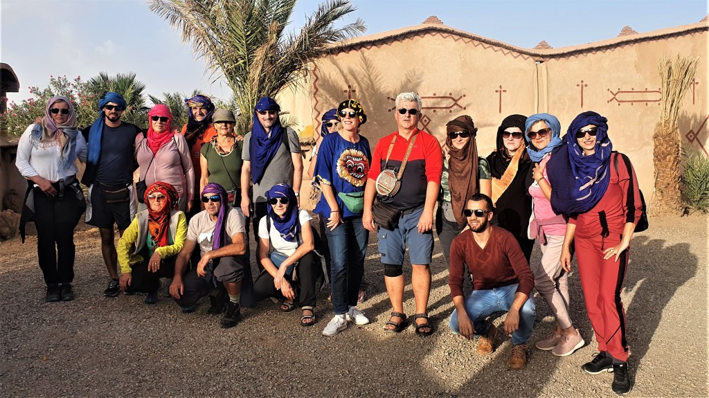 Vozimo se dolinom ruža. U suton trebamo stići u posljednje naselje prije pustinje Merzouga, a Samir zna što nam treba pa stajemo kupiti neophodno.:) Osjećam se posebno i zapravo zaštićeno! Šal je berbersko plave boje s njihovim simbolima.