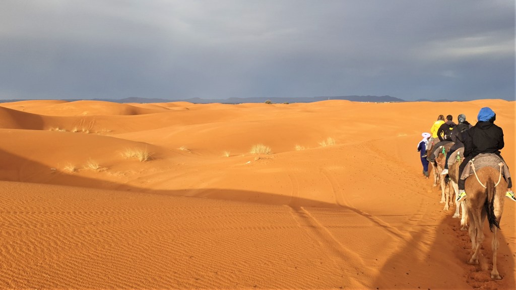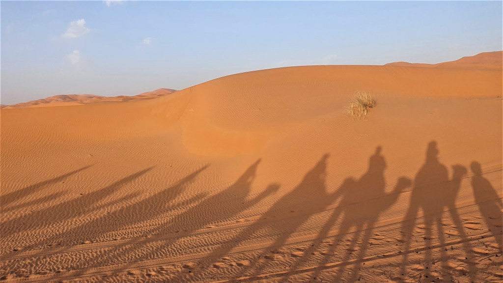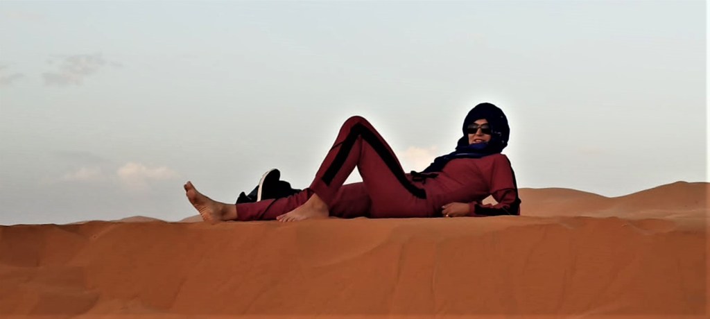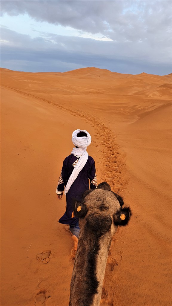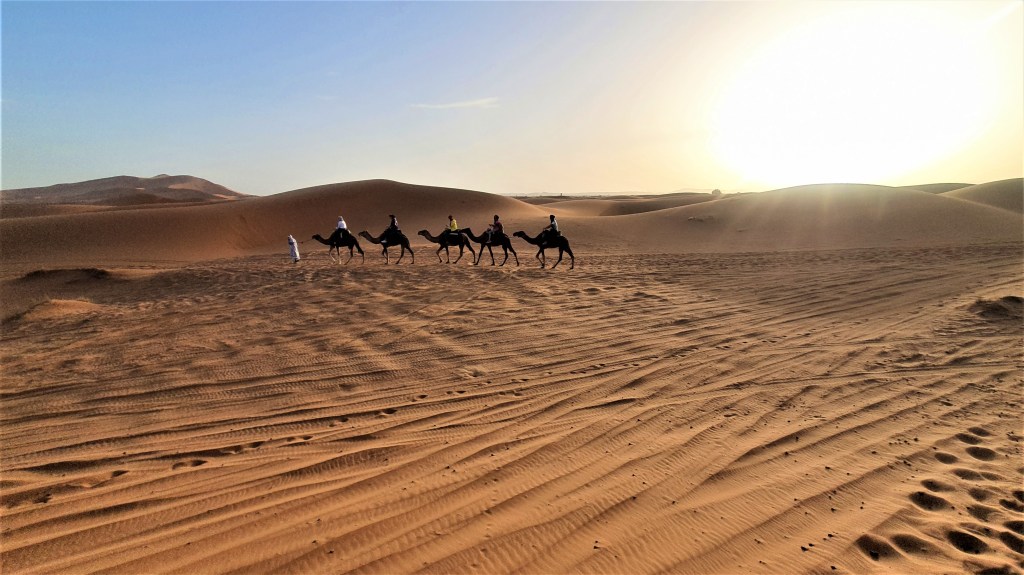 18:00 Mezouga. Vrata Sahare. Konačno na odredištu! Čaj od mente toči nam Samir s visine i tumači da se tako toči za posebne goste. Konačno deve i meki žuti pijesak! Odabrala sam jednu. “No, you will go first!”, obraća mi se mladi Berber u lijepoj plavoj haljini i s ogromnim bijelim turbanom na glavi. Bos. Je li u meni prepoznao iskusnu jahačicu – ne znam, ali jašem prva. Cijela je pustinja preda mnom sa svojim dinama, blještavim pijeskom, beskrajem…