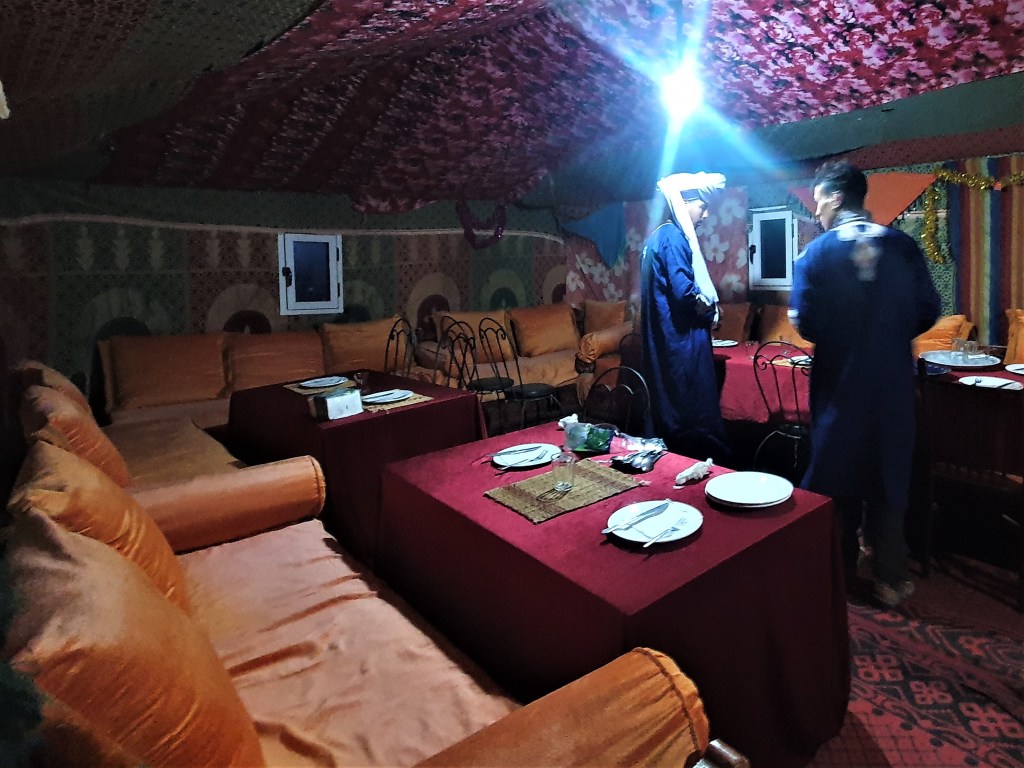 Šatori su postavljeni u krug, posvuda je pijesak prekriven tepisima, a u središtu ložište za vatru. Večeru su na stol donijeli isti Berberi koji su nas dopratili. Izbor jela je sličan kao i dosad, ambijent neponovljiv. Kad smo mislili da je gotovo pozvali su nas da sjednemo oko vatre da nam sviraju. “Oh, we have to wake up early in the morning!”, zavapio je netko. “Live in the moment, enjoy the moment. It’s all we have.”, riječi su najstarijeg.