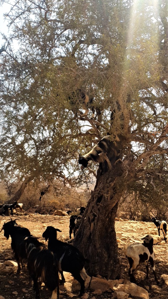 Nekoliko sati kasnije Jasminka nam govori o proizvodnji argana jer se vozimo kraj kilometara arganovih stabala. “Stani, stani! Koze na stablima argana brste plodove.” Stali smo, koze nam bježe, no stari Berber neodoljivog krezubog osmjeha spretno ustaje i traži novac za slikanje. Te koze probave plod, ali koštice koje prođu kroz probavni trak ljudi skupljaju i od njih proizvode ulje. 🙂