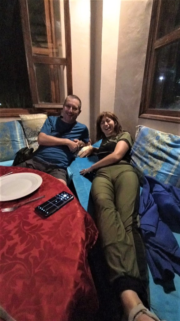 21:30 Grad Quarzante, hotel. Uzimamo ključeve od soba i spuštamo se na večeru. Boje su divne, a divani oko stola mame na ležanje. Konobar pita što ćemo popiti i nudi vino, marokansko. Našem čuđenju, a i sreći nema kraja. “Hajde se slikaj sa mnom!”, tražim Gorana jer sjedi pored mene. “Ma ne, bojim se što će reči D.” Valjamo se od smijeha jer nije mislio na mog muža. “Jedva čekam da dođem doma da pročitam blog!” , dodaje. Inače zbog ovdašnje tradicije, gdje žena ne bi trebala šetati sama, Sandra i ja smo odabrale Gorana da mu budemo druga i treća žena. Marijana se, naravno, slaže.