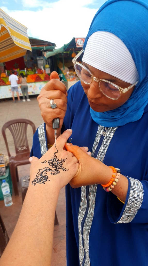 Nakon ručka site – znači sretne lepršamo glavnim trgom tek da krajičkom oka pogledamo ima li zmija. Prilazi nam simpatična žena, pita odakle smo, a nudi oslikavanje ruke kanom. Dok joj odgovaramo uzima Sandrinu ruku i cvijet je već nacrtan. Samo će nam pokazati, kaže, ali ne miruje. “Sit a moment, please!” i Sandrina je ruka oslikana. “Let me see your hand, madam!”, a ja gledam i ne vjerujem. Linija po linija, prst po prst. “Should we pay for it now?”- “Yes, yes. The price is 60 € each.” Izvukle smo se s 10 € svaka.