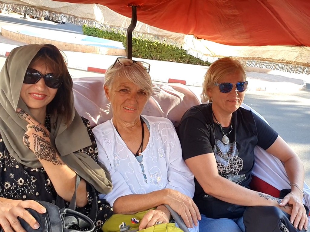 Prva noć u Marrakechu. Naša mala ekipa smjestila se u hotelu Ali odmah iznad glavnog gradskog trga Jemma el Fna što znači “sastajalište mrtvih” jer do 18.st. ovdje su se izlagale odrubljene glave zatvorenika kao upozorenje za nepoštivanje zakona. Ključ koji smo dobile Sandra i ja otvorio je ugodnu sobu, finu kupaonu, a onda smo izašle na terasu – pa ovo je penthouse! Brzo se presvlačimo i hitamo zajedno s dijelom ekipe u more zabave. Između preglasne arapske glazbe i previše ljudi jure konji, auti, bicikli i motori. Pokušavamo se probiti na drugu stranu Trga. Svi nešto hoće od nas. Unose nam se u lice. Hranu nude. “No, thanks!” or “I’m not hungry.”, ne znači im baš ništa. Iznad klupa i stolova vise komadi mesa i glave životinja. Na roštilju izunutrice, iz velikih lonaca izlaze puževi. Ugostitelji su iznimno nametljivi. Vičem i stavljam ruke u obrambeni položaj. Da sam Tom Cruise sve bih ih porazbacala i prošla. Uzrujana sam. U okolnim uličicama je jednostavna ulična trgovina koještarijama i ugodna komunikacija, no neki su gladni. Ja se u to ludilo ne vračam. Biramo Sandra i ja miran, potpuno prazan restoran pored hotela. Svira instrumentalna berberska glazba, konobar nam se blago klanja uz “Welcome my ladies!” – “Two teas, please, and if you have some cake!” Divnog li mjesta!