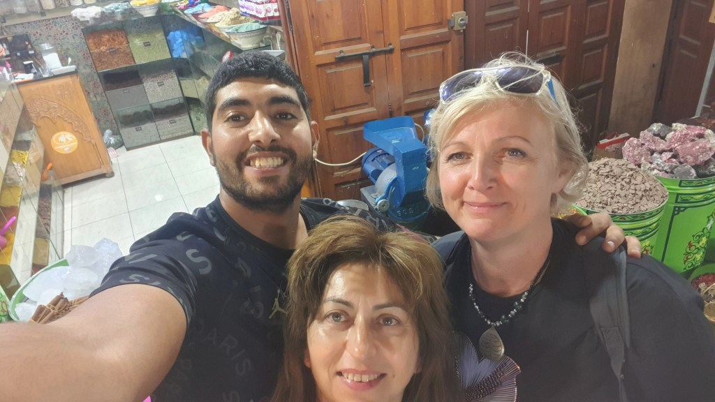 Sandra je stala kraj začina, tj. kraj mladog prodavača. To je tek trajalo. Dok nam je dao svašta da pomirišimo, pripremio čaj od specijalne mješavine, dodao eukaliptus u kristalićima, izmasirao glavu, objasnio od čega je mješavina za kus-kus, za što se koristi eukaliptus, izvagao, izračunao, prepolovio, dodao poklon svakoj…Rastali smo se kao prijatelji!
