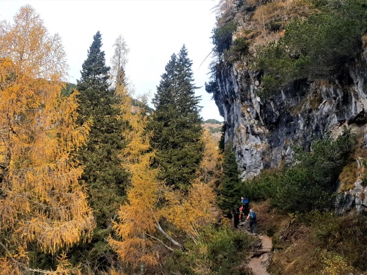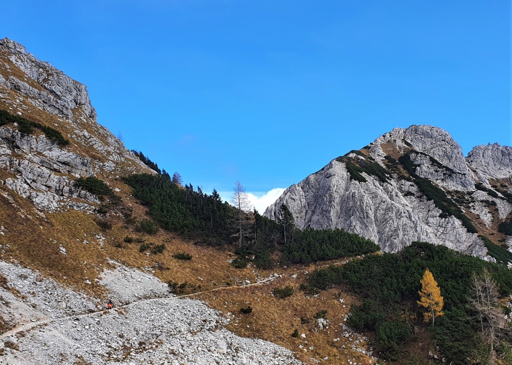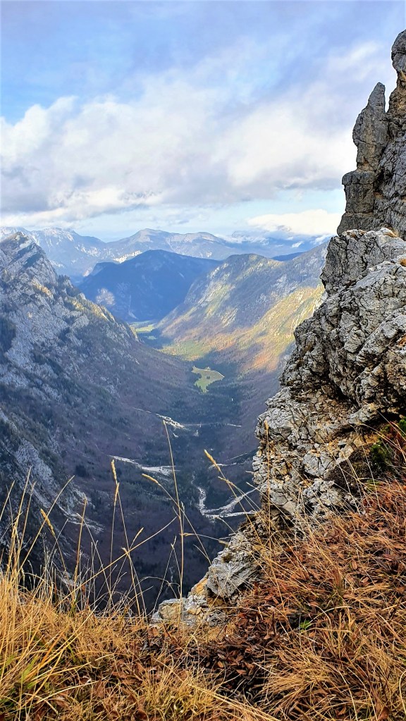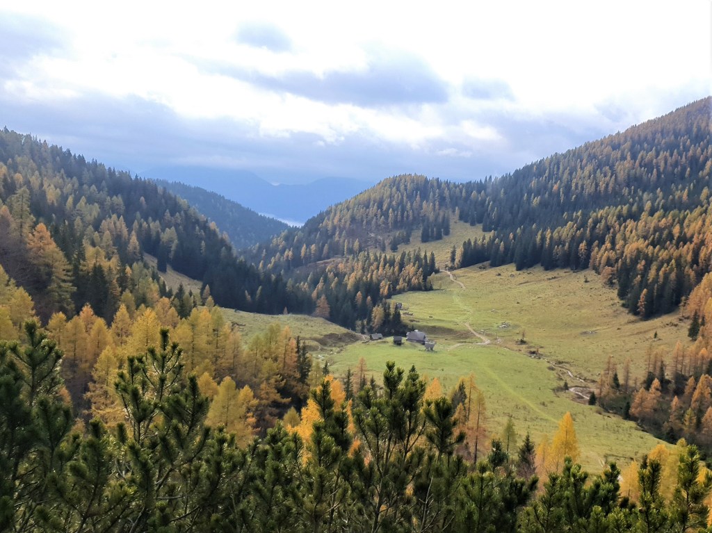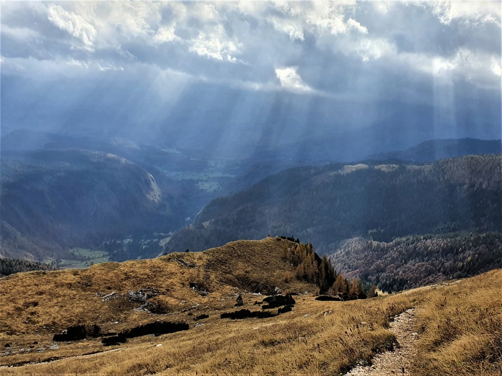 Kiša nas je dopratila do Pokljuke (1000 m). Ona je stala, a mi smo krenuli. Krenuli kroz najveću šumsku cjelinu Slovenije površine cca 20 km x 20 km, između bezbroj stabala visokih smreka vlažnom stazom s mirisom gljiva. U visine. Umjesto sunca zlaćano sjaje krošnje ariša. Jesen je u Julijskim Alpama. Nigdje nijednog cvjetića.